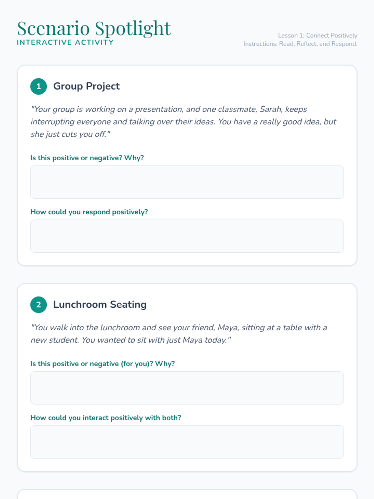Empathetic skill development through emotion recognition, cultural diversity appreciation, and bias confrontation. Targets multi-perspective analysis to support respectful interactions and complex social responses.