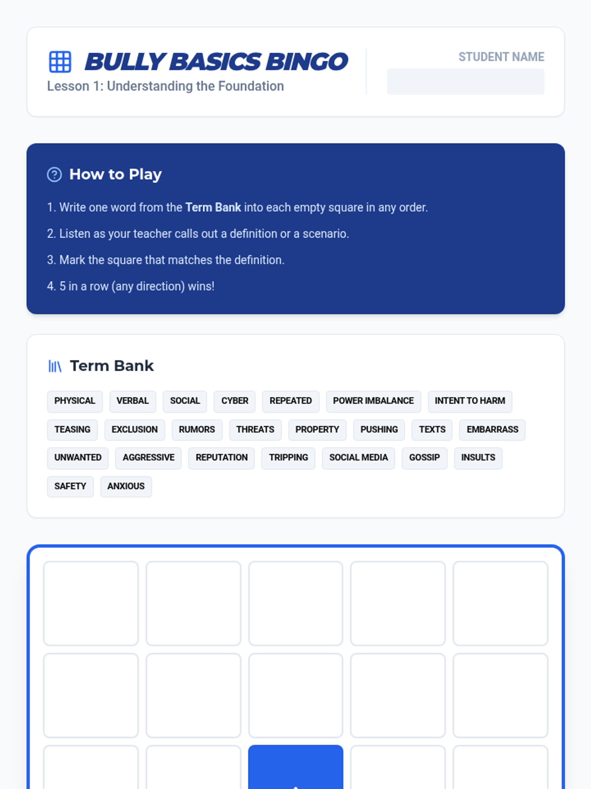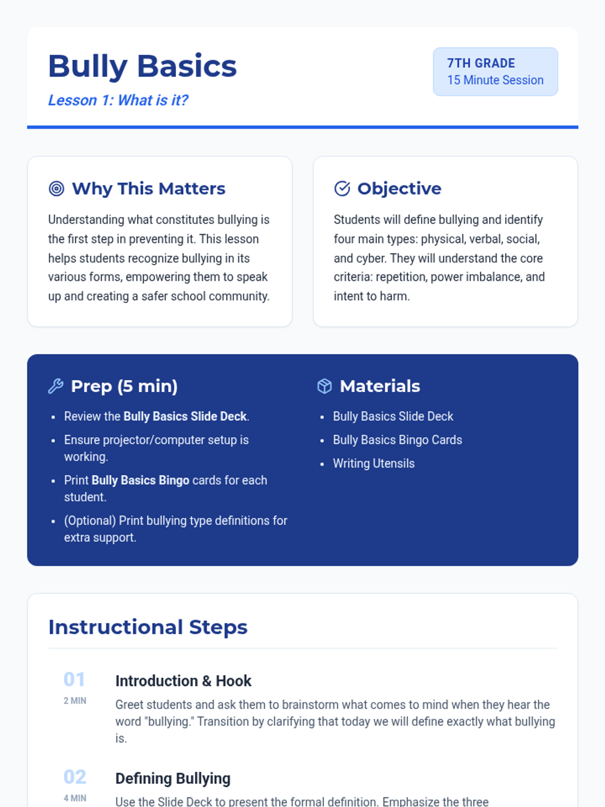 A 4-part bullying prevention series for 7th-grade students, covering definitions, root causes, response strategies, and proactive community-building.