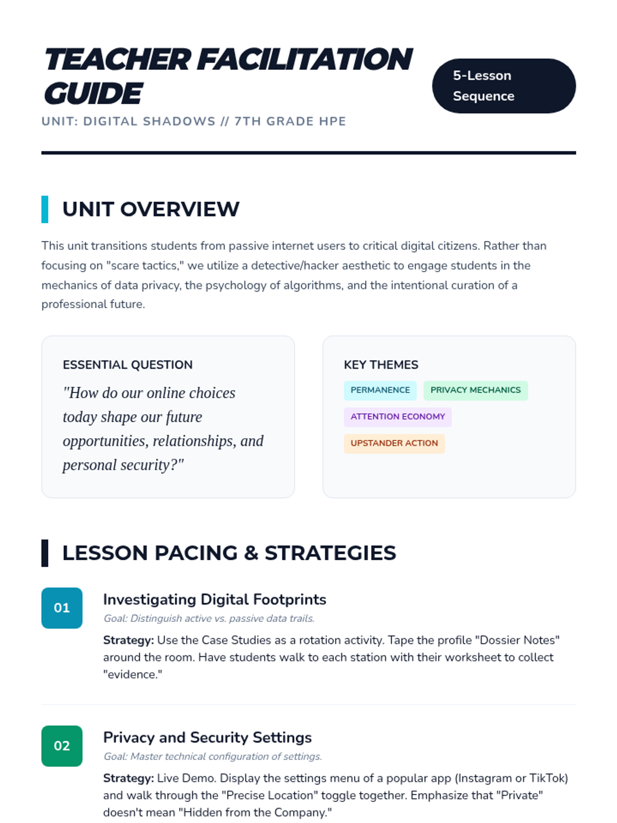 A comprehensive unit for 7th-grade students to analyze their digital footprints, master privacy settings, resolve online conflicts, and intentionally curate a positive online reputation. Students transition from passive users to critical, ethical digital citizens.