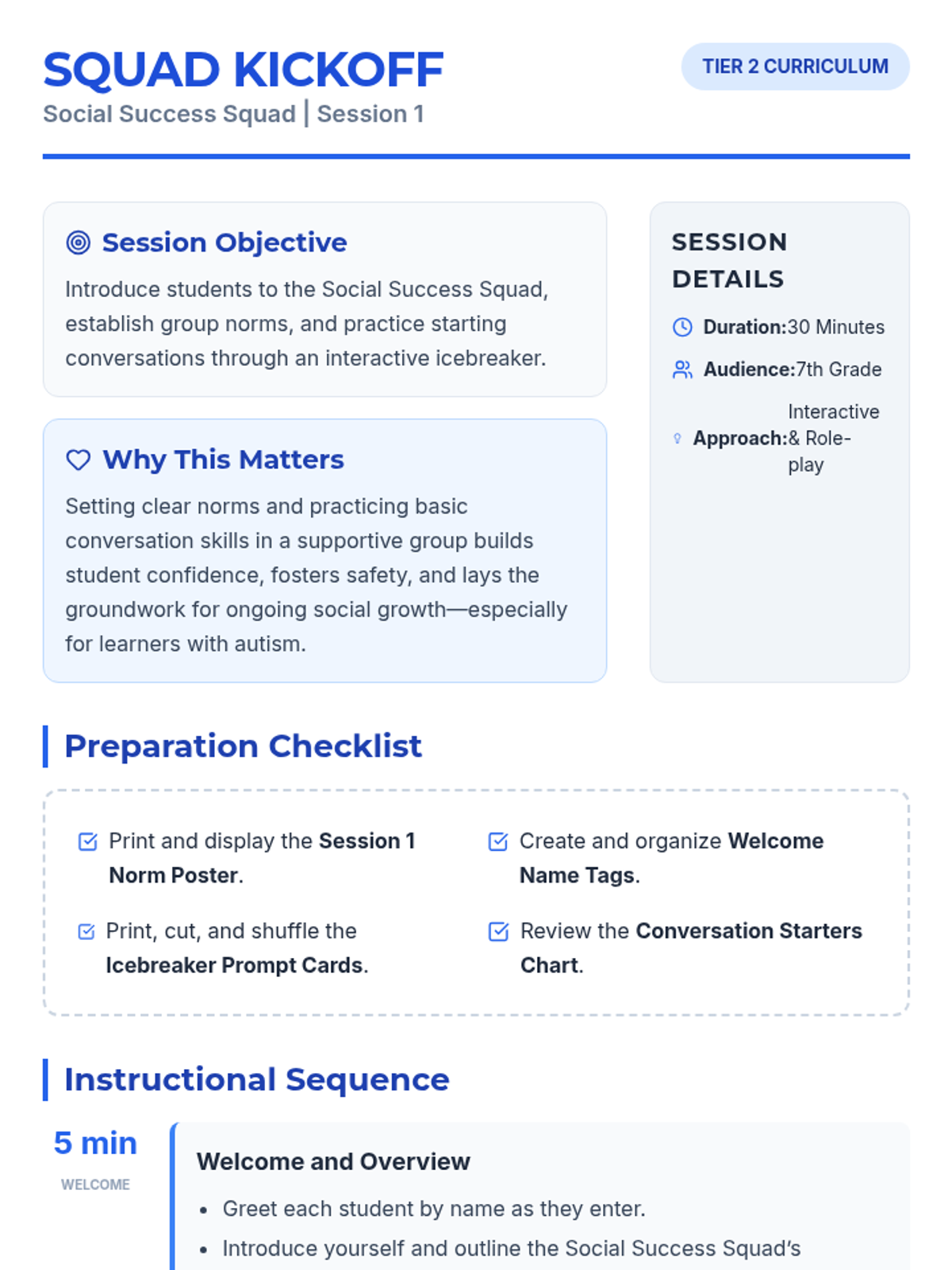A 6-session social skills curriculum for 7th graders designed to build confidence and communication skills, specifically supporting students with autism in a Tier 2 small group setting.