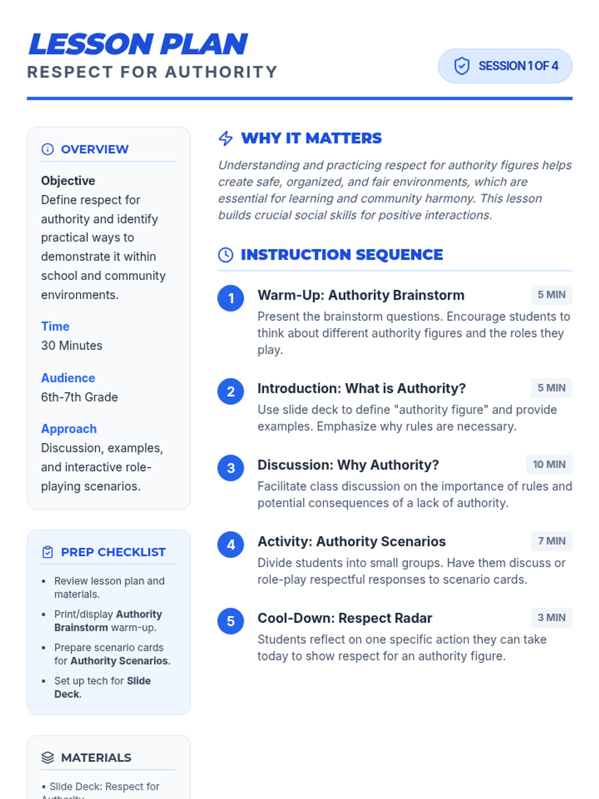 A 4-week Tier 2 intervention sequence for middle school boys to develop social-emotional skills in respectful interaction, self-advocacy, and conflict resolution.
