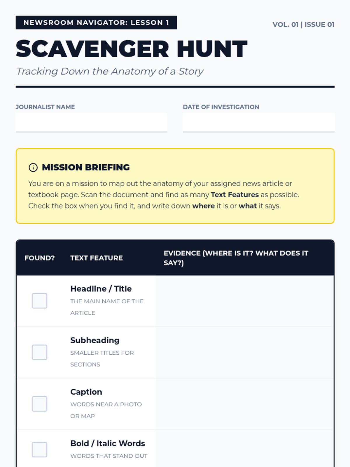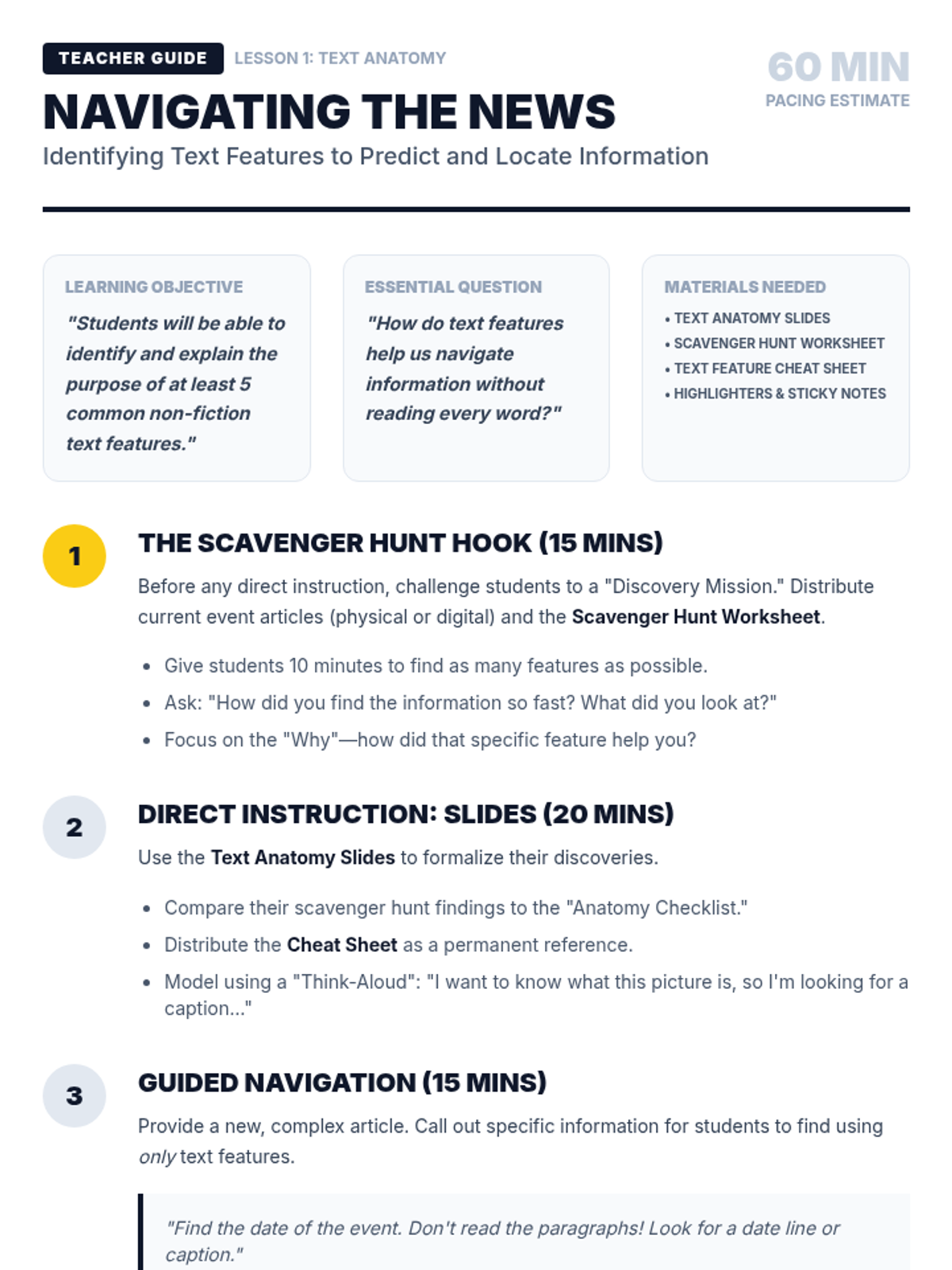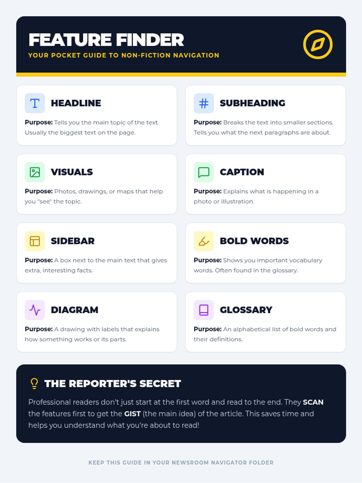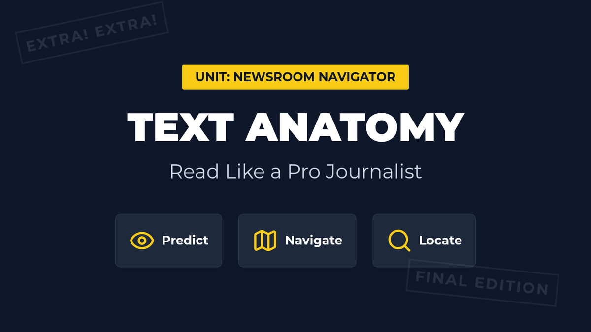 A comprehensive 8th-grade reading sequence designed for intermediate ELL students to master identifying main ideas and analyzing non-fiction text structures. Through a journalist-themed lens, students move from identifying surface-level text features to critically comparing how different structures convey central ideas.