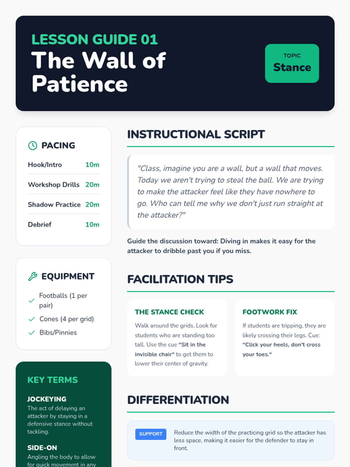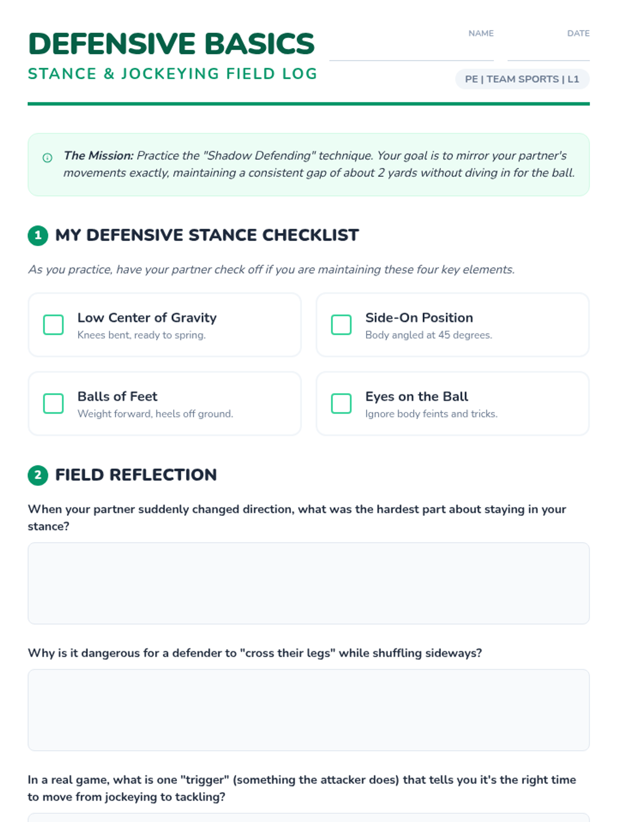 A comprehensive 7th-grade unit on soccer defensive tactics, focusing on individual positioning, timing of tackles, group coordination, and transitional awareness. Students move from basic stances to complex game scenarios.