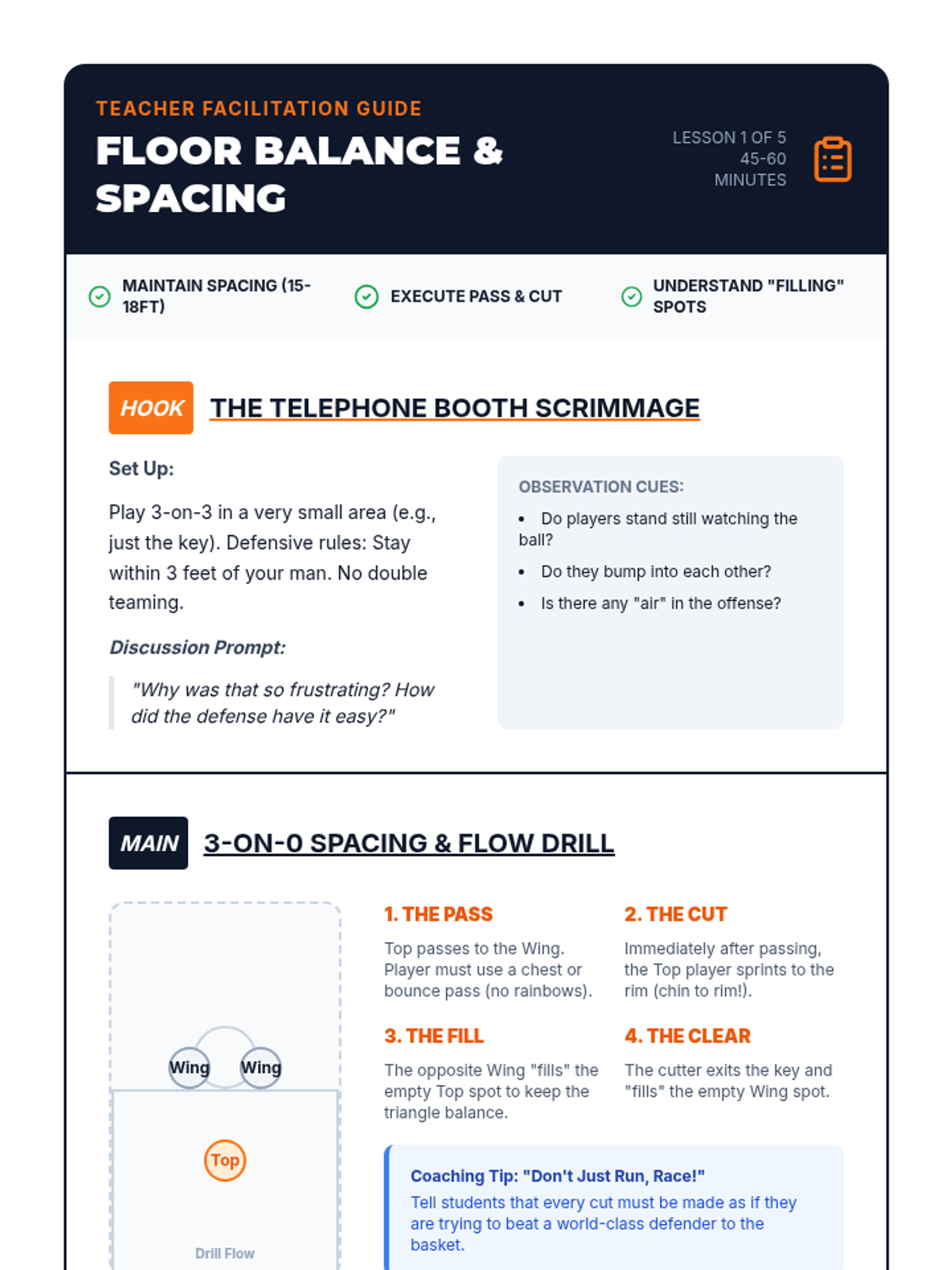 A 5-lesson sequence for 7th-grade students focusing on the tactical side of basketball, including offensive spacing, defensive positioning, screening, and transition play. Students move from individual skills to collective 'Basketball IQ' through simulations and small-sided games.