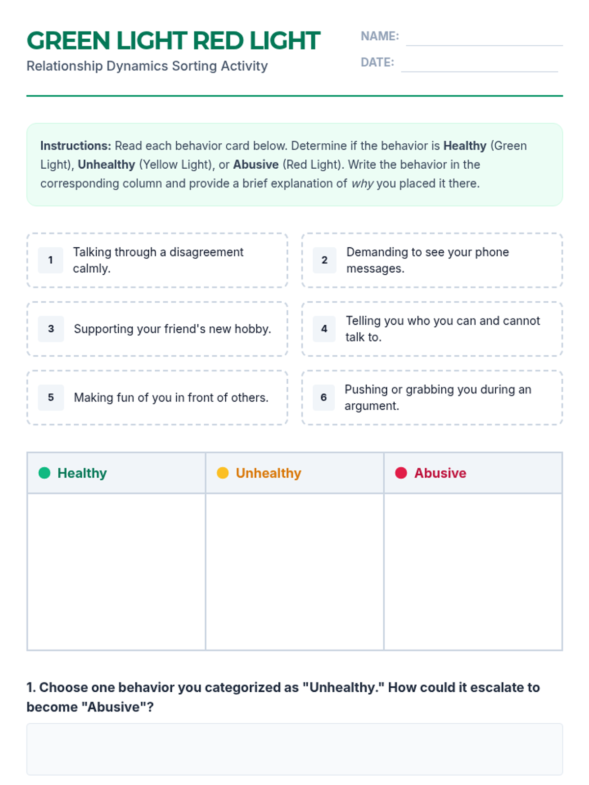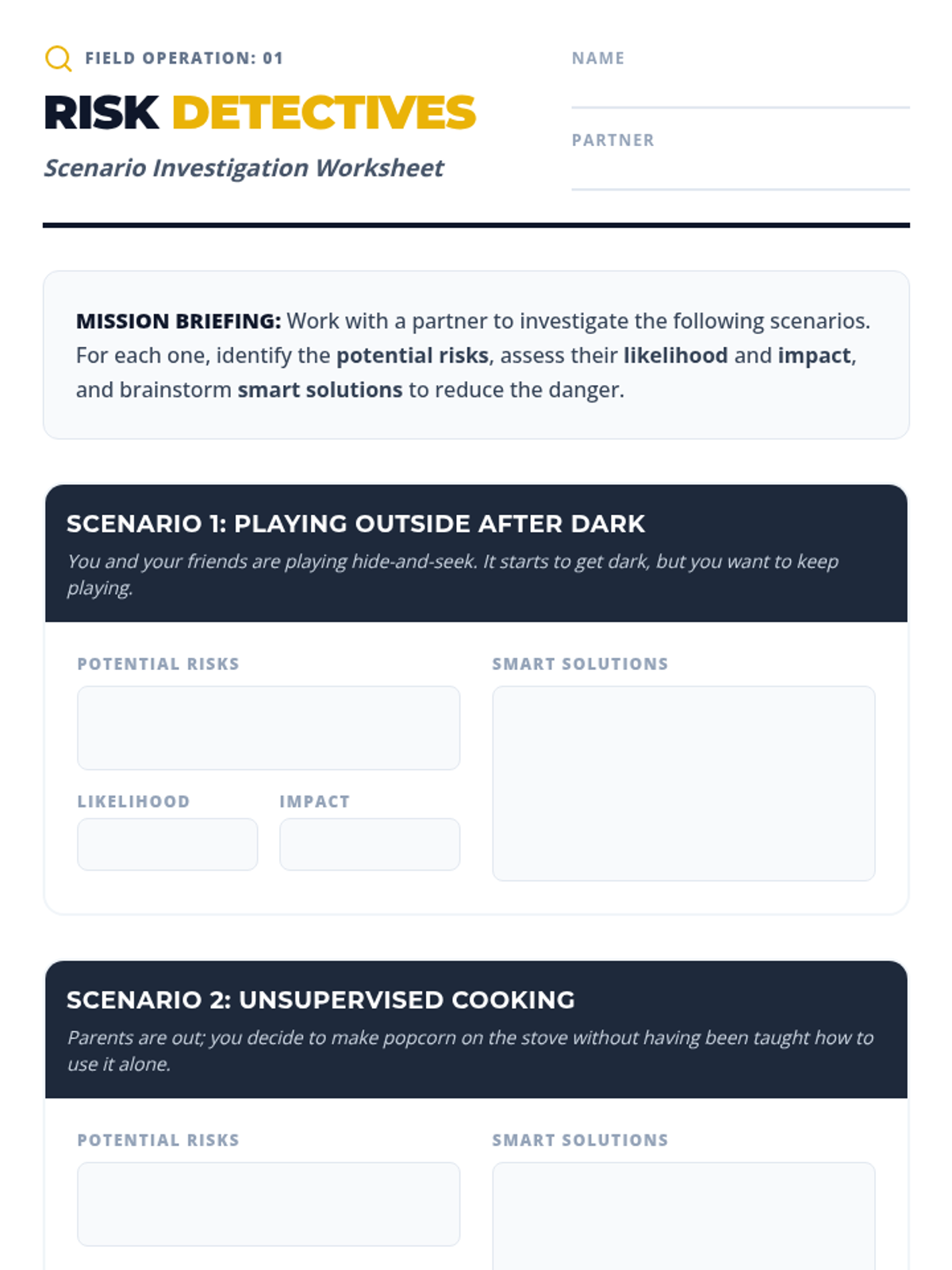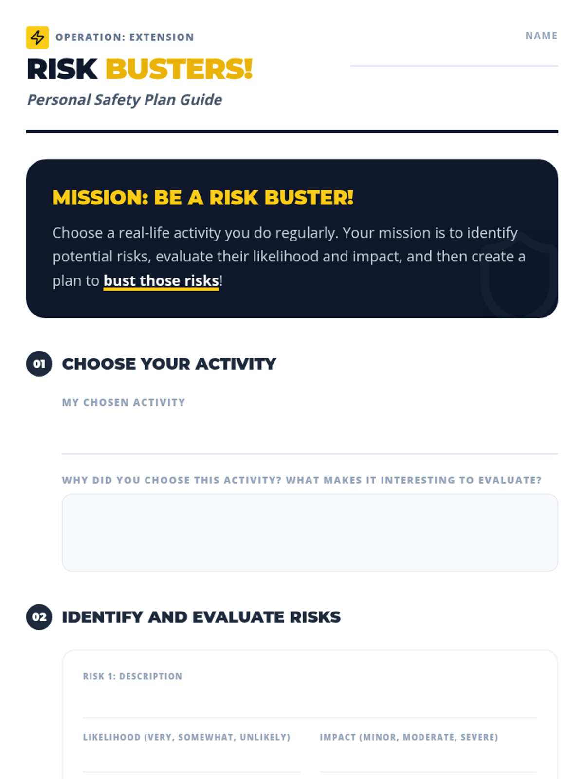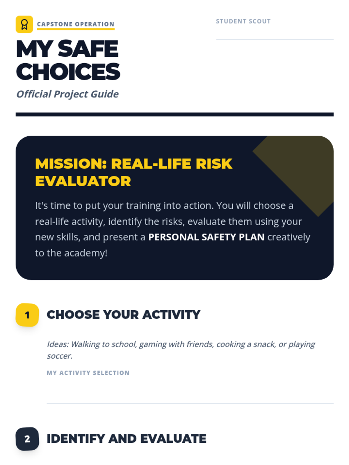 Personal boundaries, emergency response protocols, and digital security measures for physical and online environments. Equips students to recognize unsafe situations, navigate conflict, and understand risks associated with trafficking, fire, and water safety.