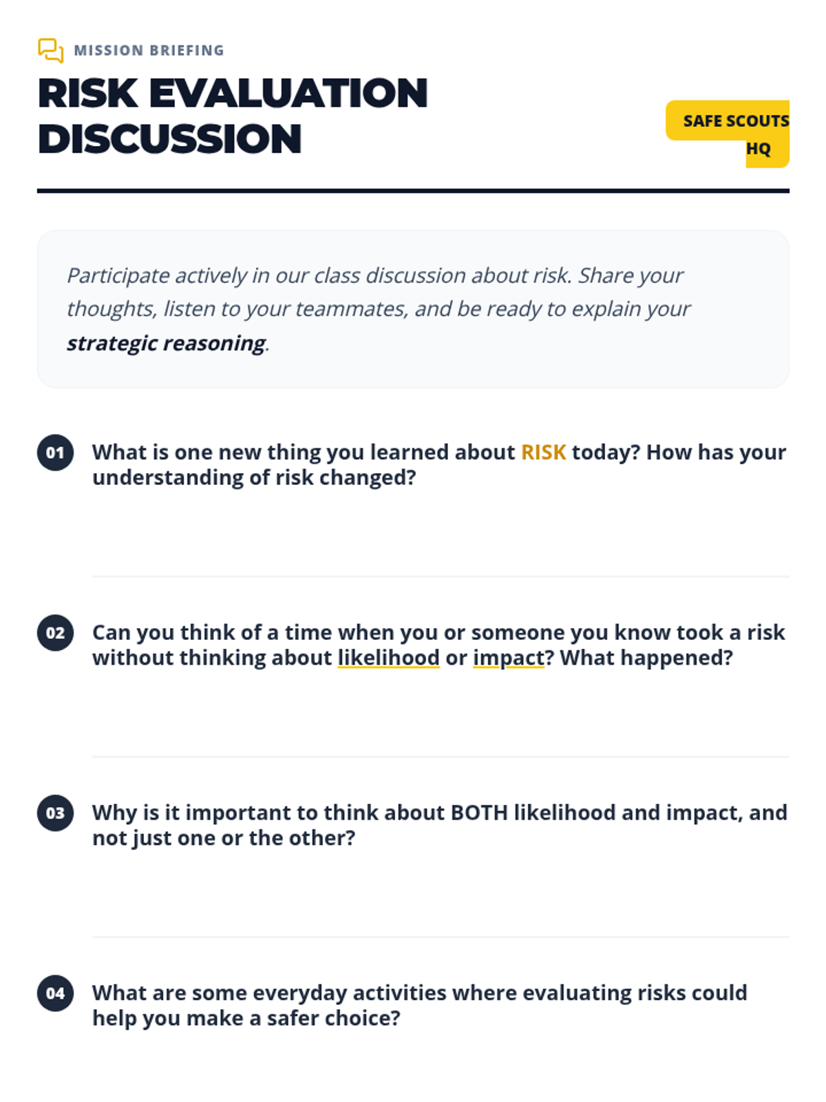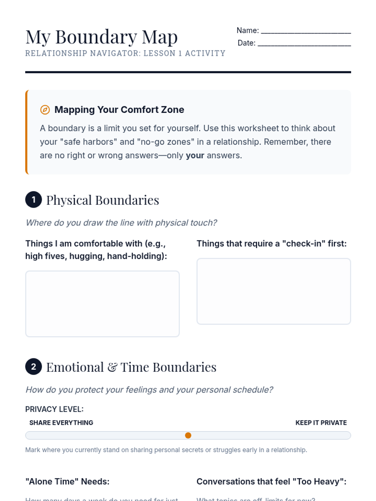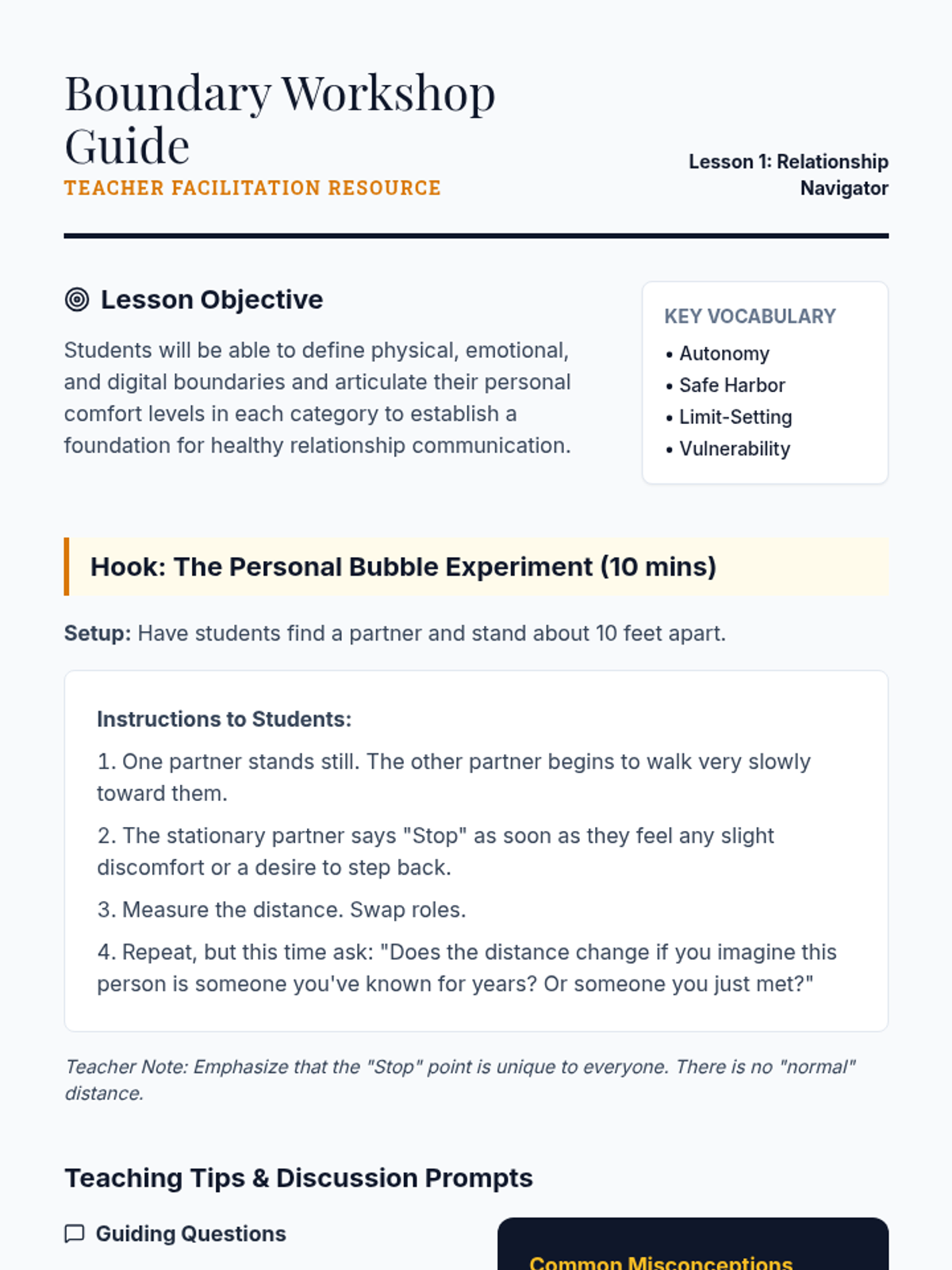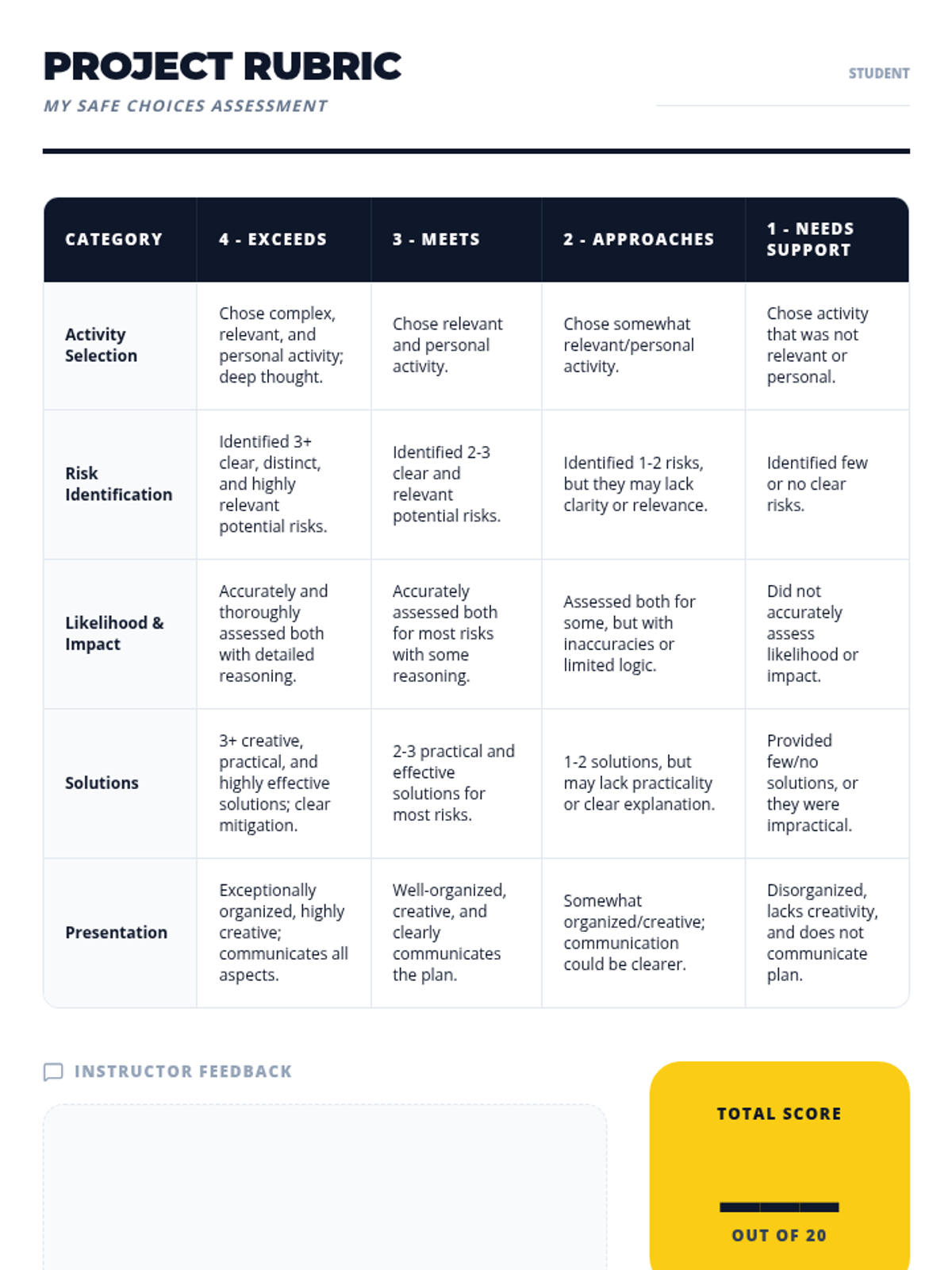 Personal boundaries, emergency response protocols, and digital security measures for physical and online environments. Equips students to recognize unsafe situations, navigate conflict, and understand risks associated with trafficking, fire, and water safety.