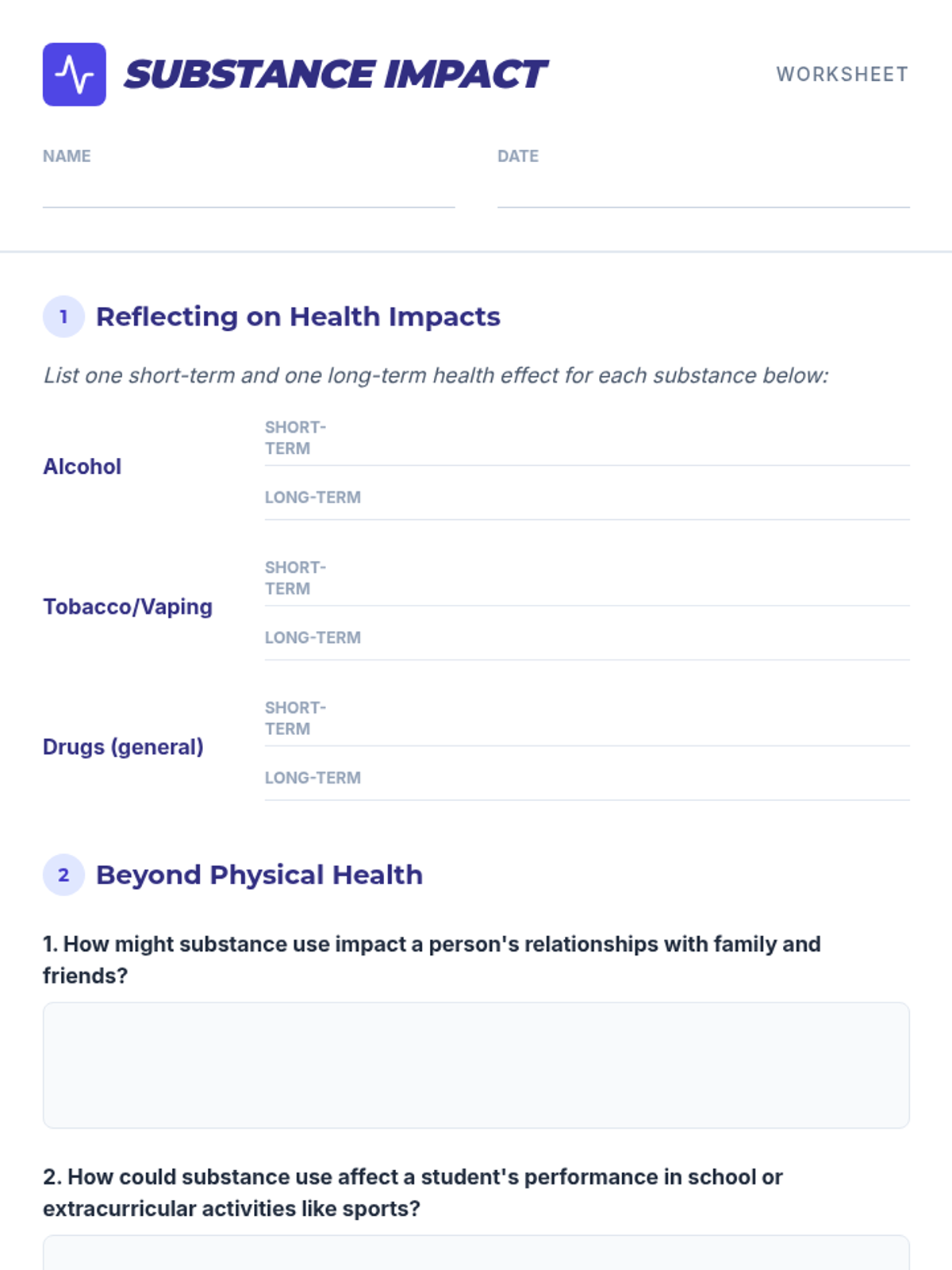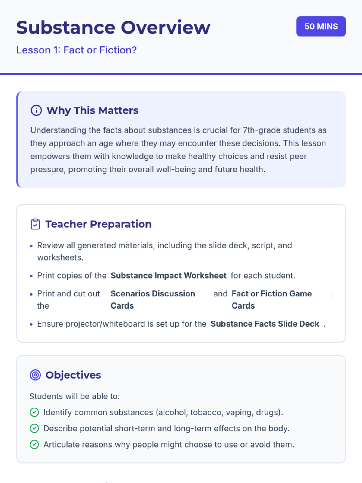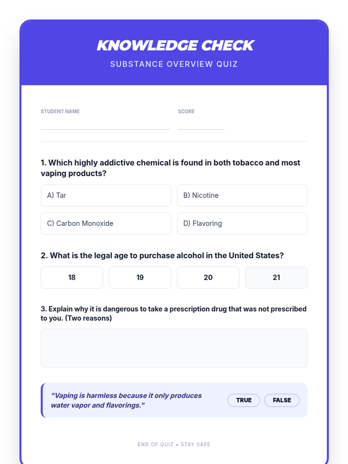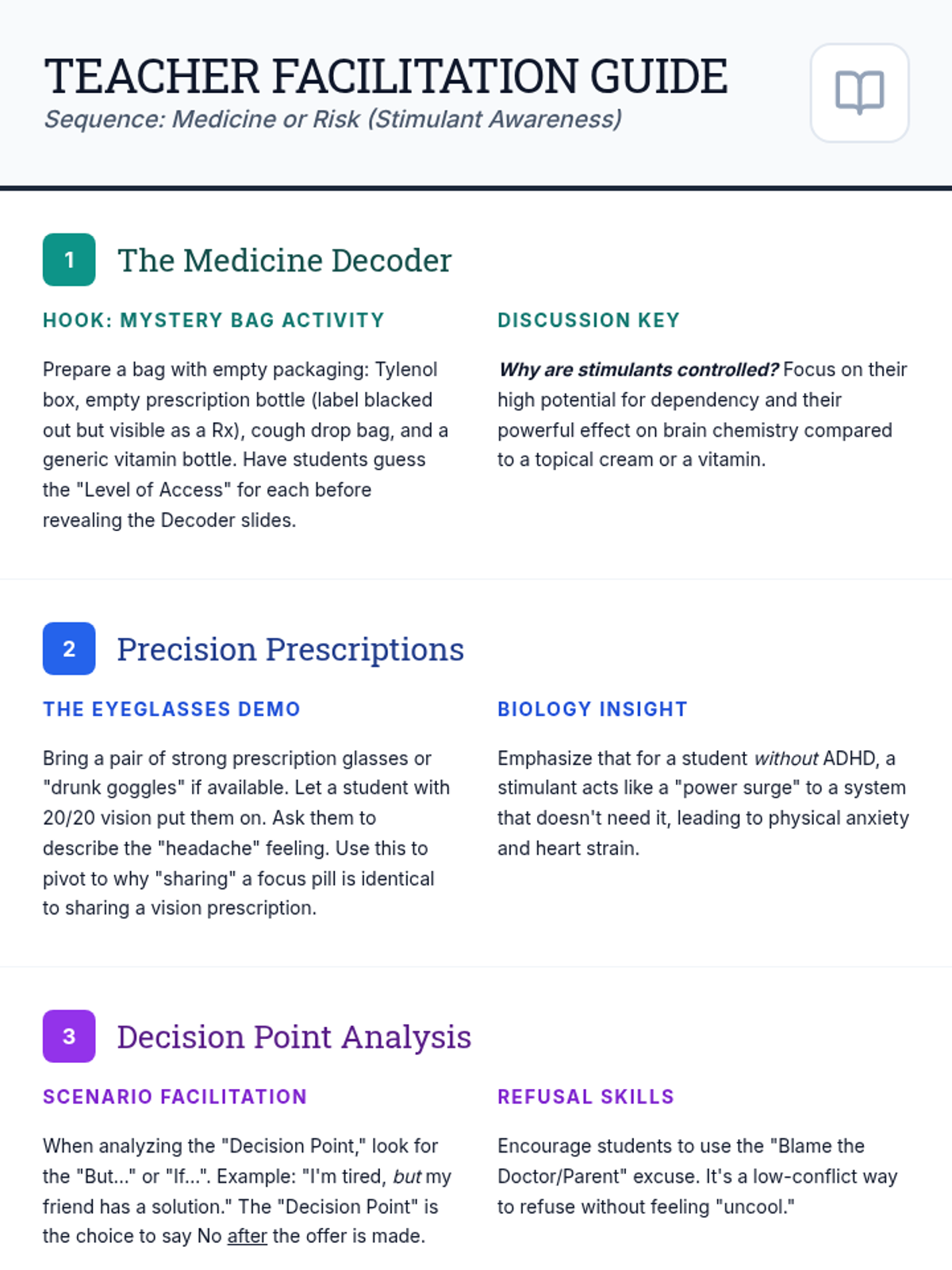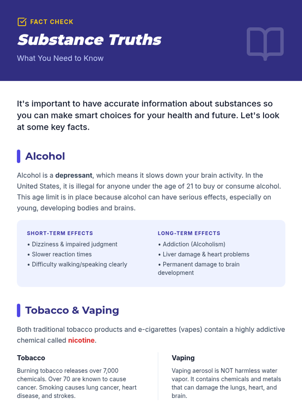 Physiological and social impacts of tobacco, alcohol, cannabis, and narcotics like opioids and stimulants. Equips students with specific refusal techniques to navigate peer pressure and make informed health decisions regarding prescription and illicit substances.