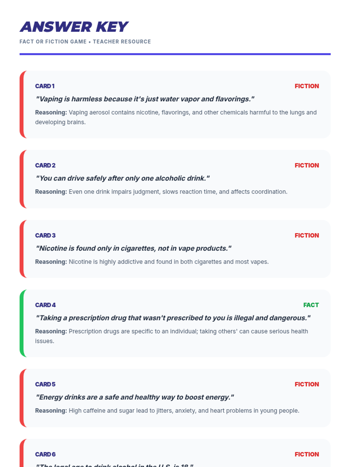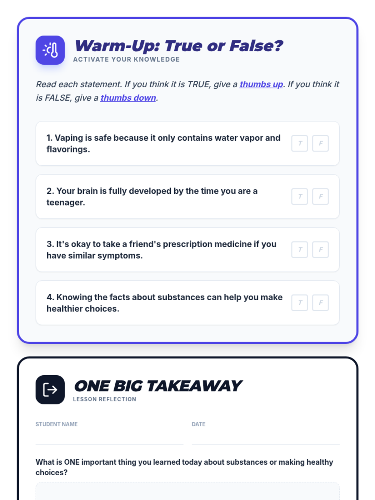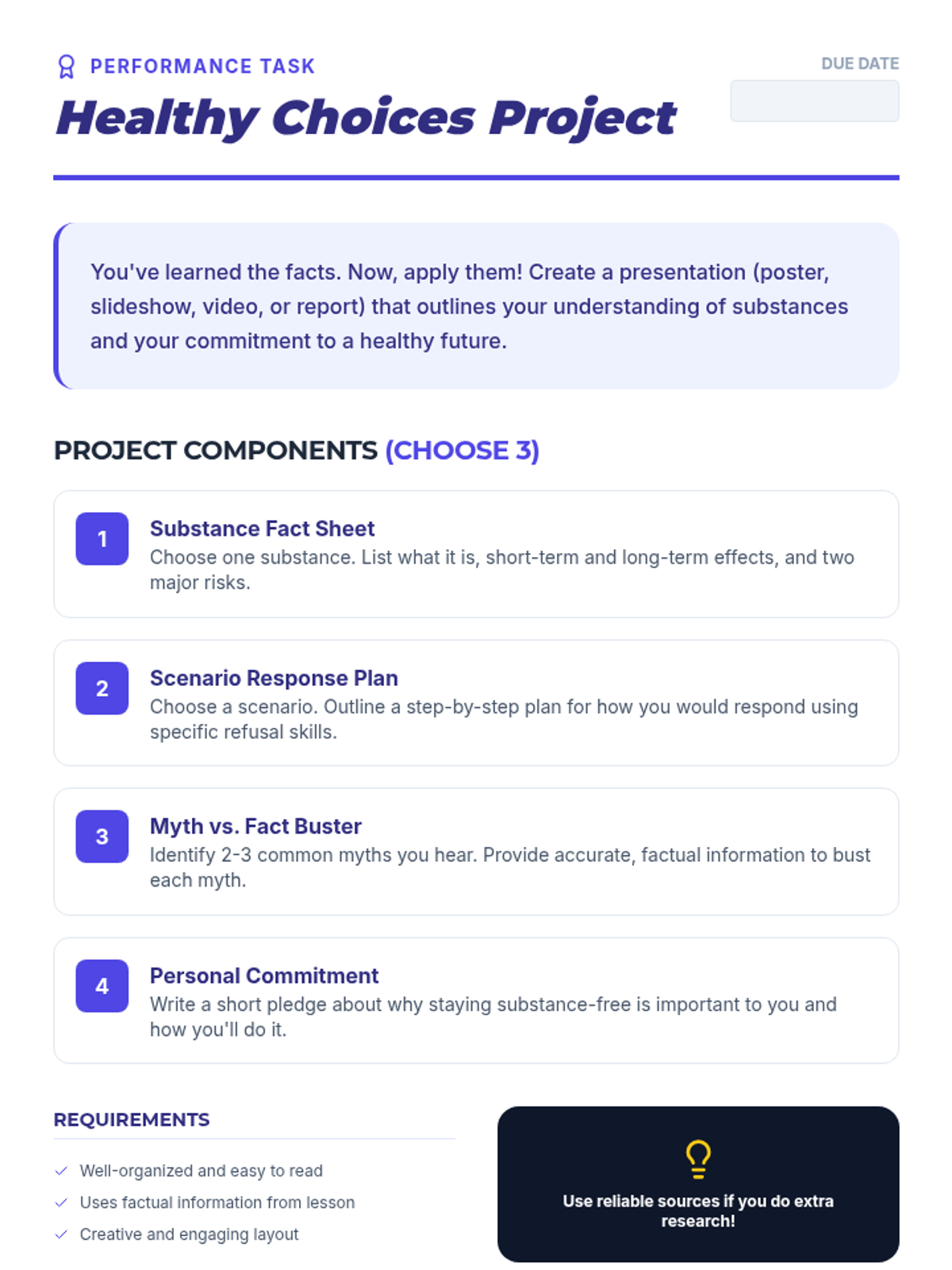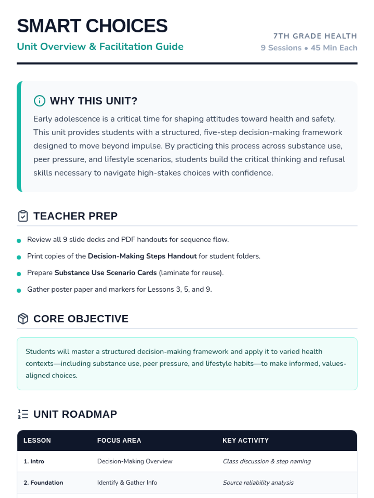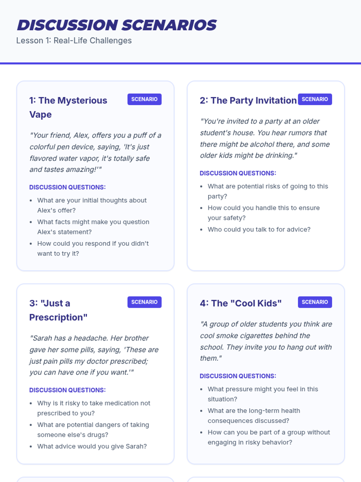 Physiological and social impacts of tobacco, alcohol, cannabis, and narcotics like opioids and stimulants. Equips students with specific refusal techniques to navigate peer pressure and make informed health decisions regarding prescription and illicit substances.