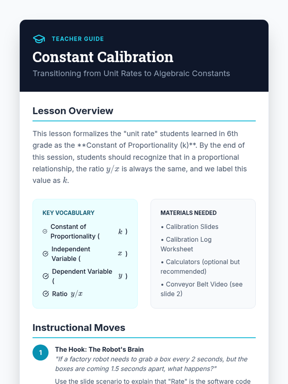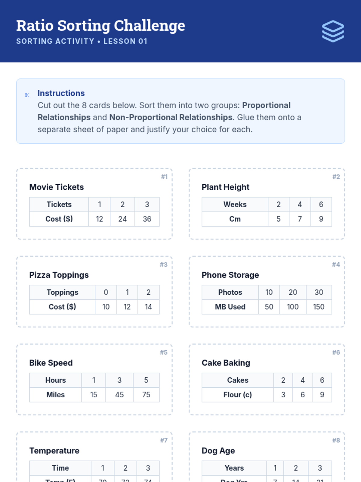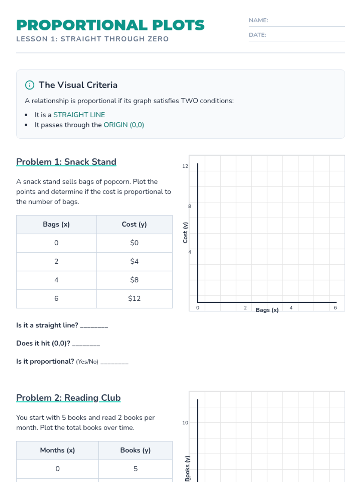 Proportional Relationships and Linear EquationsConnects ratios, unit rates, and linear functions through graphing and algebraic modeling. Links the constant of proportionality to the slope of a line in both mathematical and real-world contexts.
