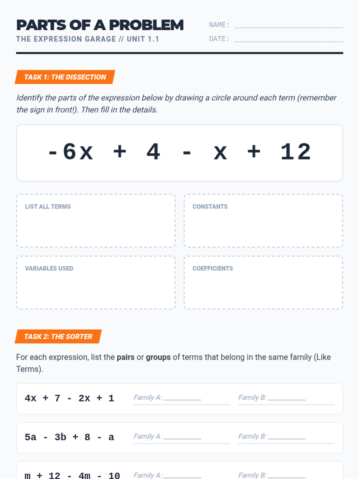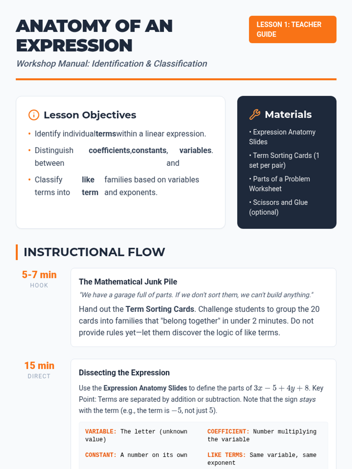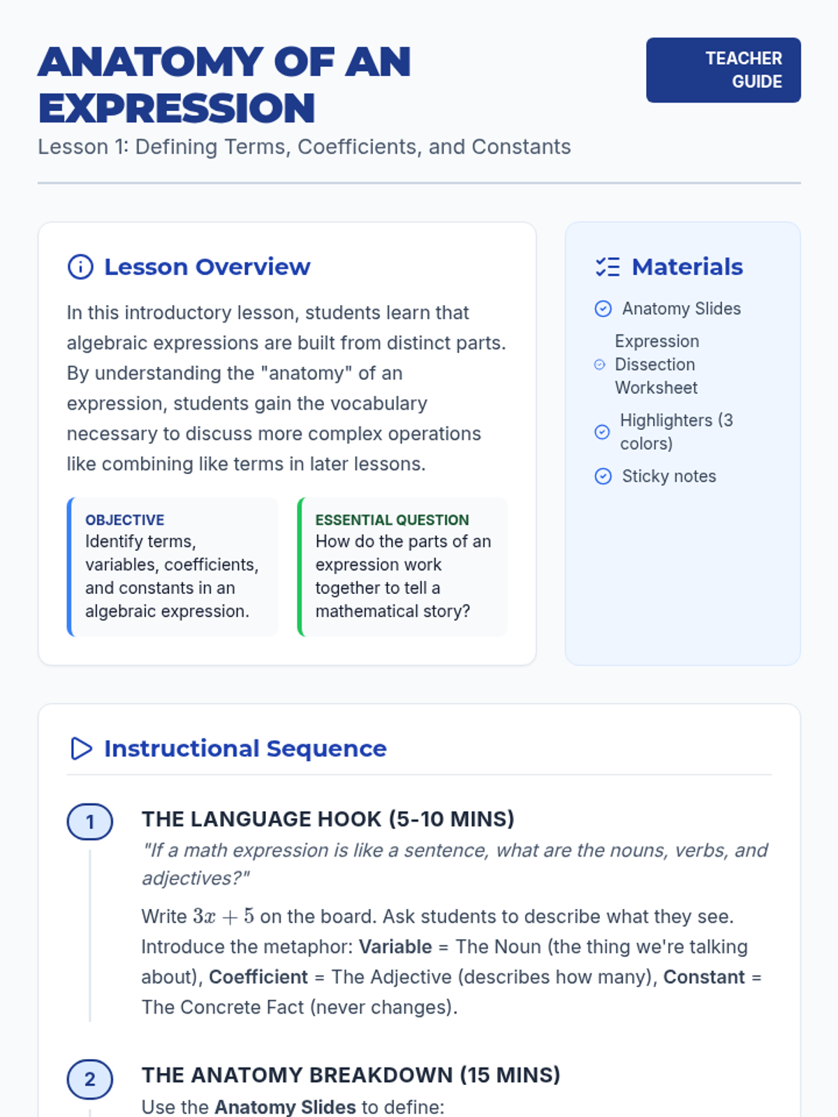 A comprehensive unit for 6th-grade students on identifying, reordering, and combining terms to simplify algebraic expressions. Students progress from basic vocabulary to complex multi-variable simplification using visual models and mathematical properties.
