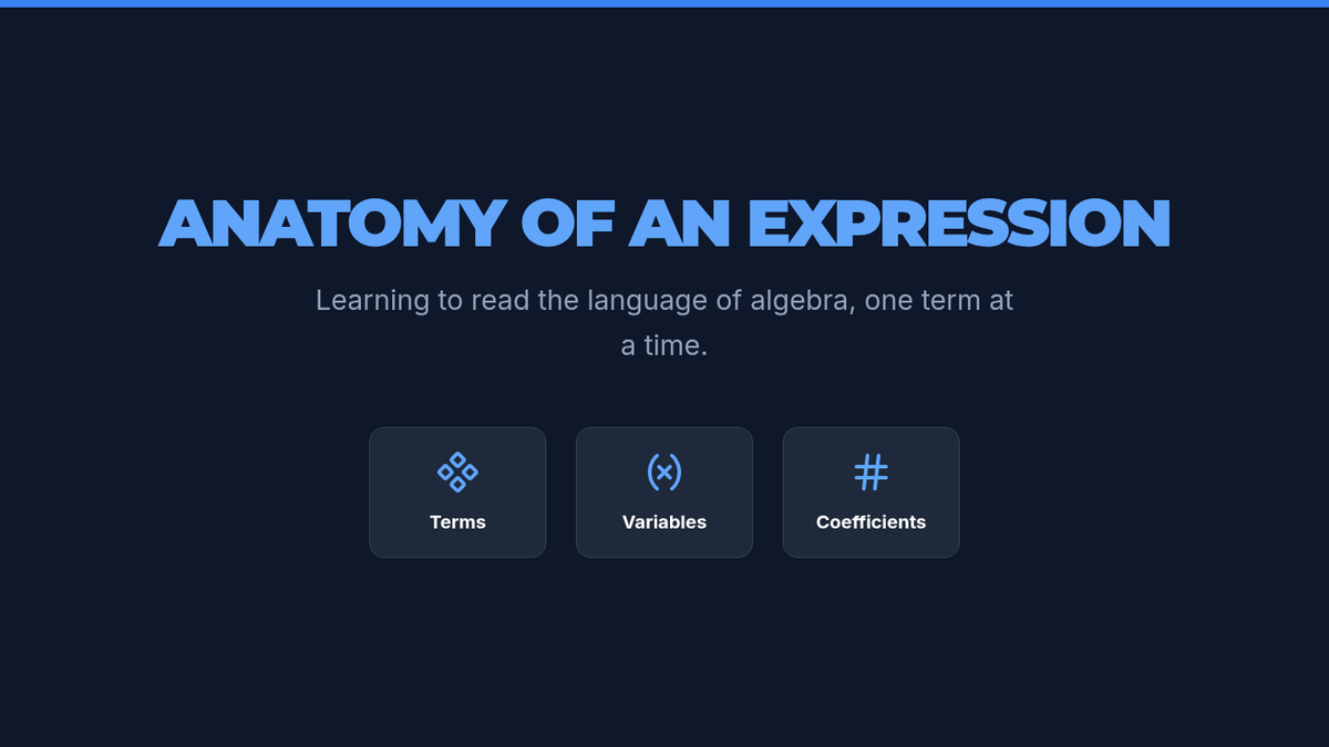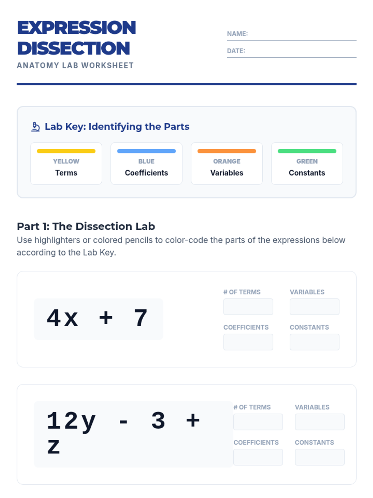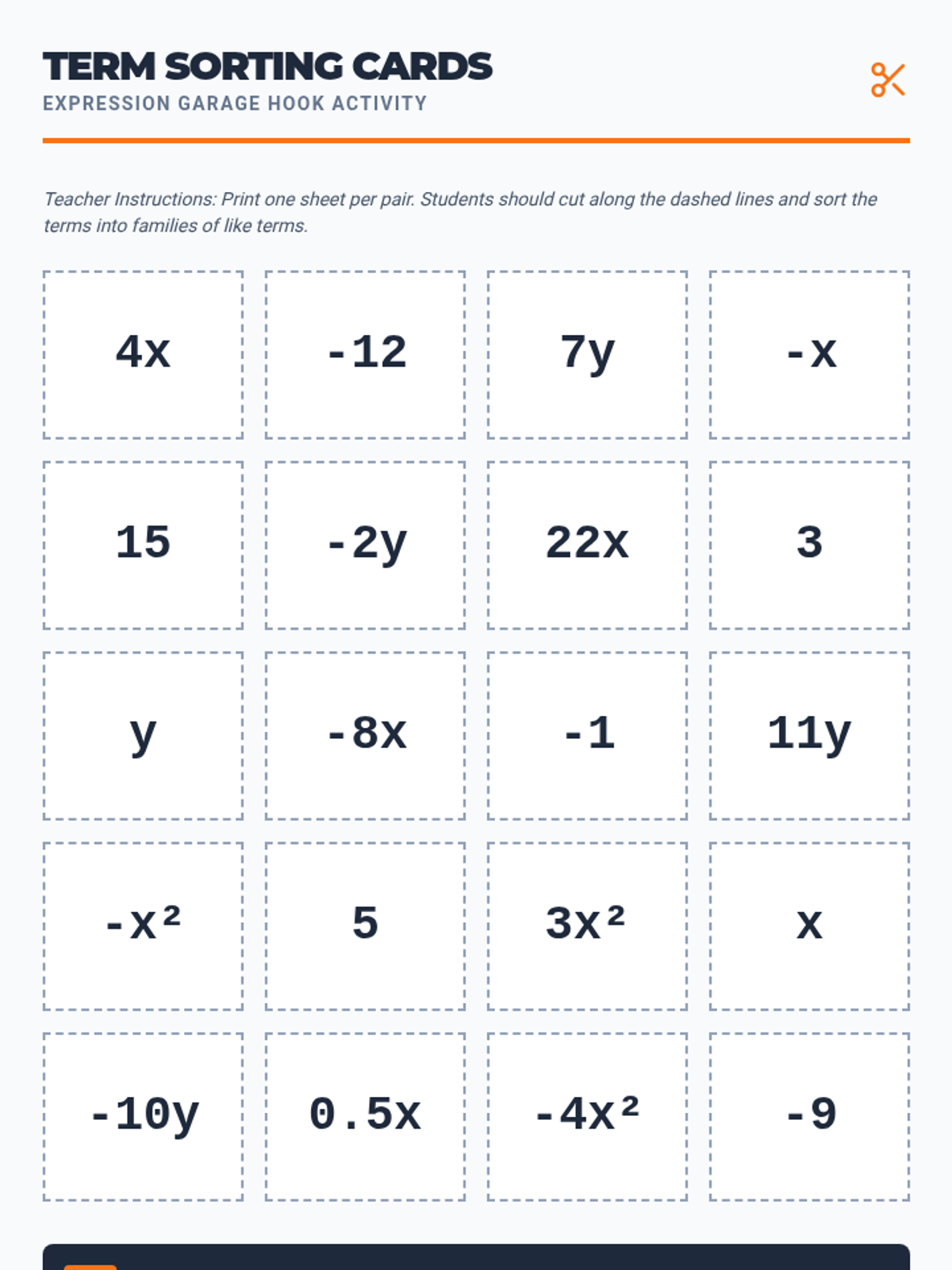 A comprehensive unit for 6th-grade students on identifying, reordering, and combining terms to simplify algebraic expressions. Students progress from basic vocabulary to complex multi-variable simplification using visual models and mathematical properties.