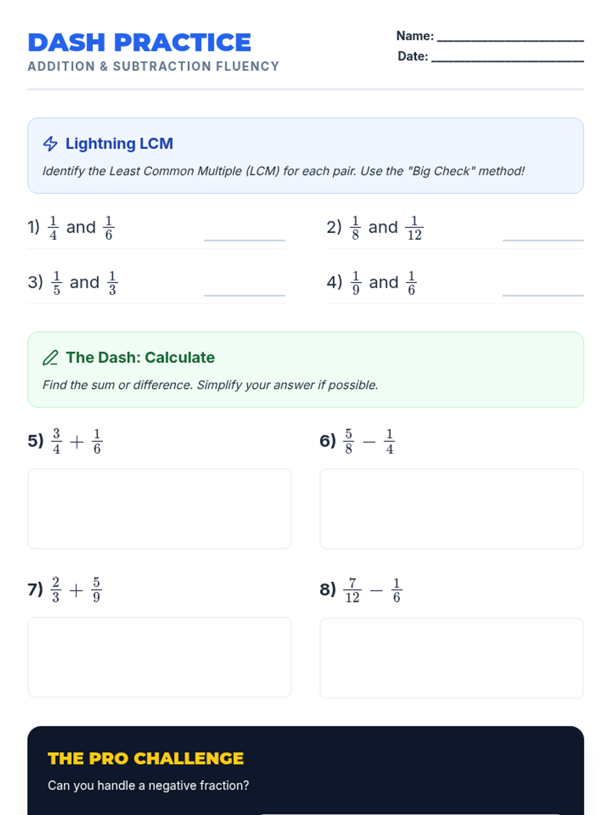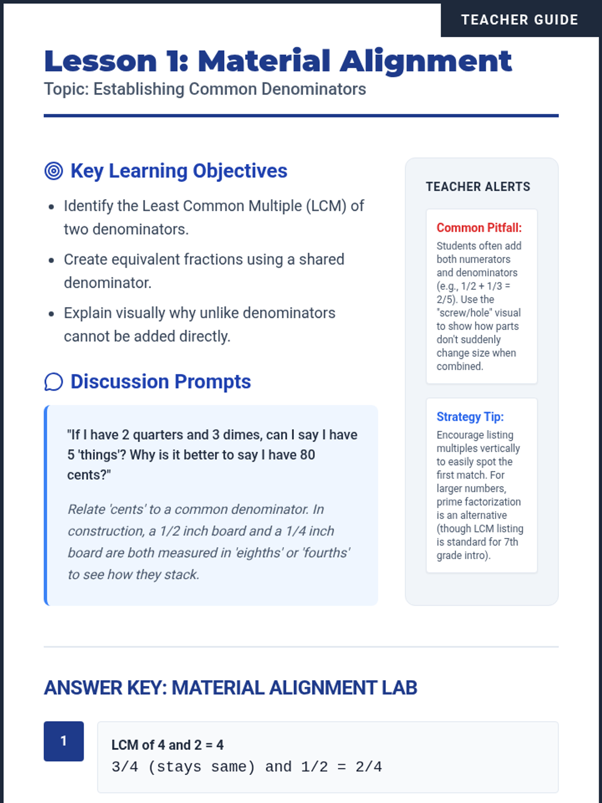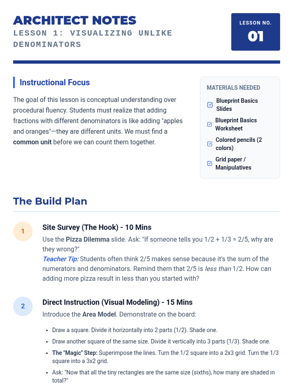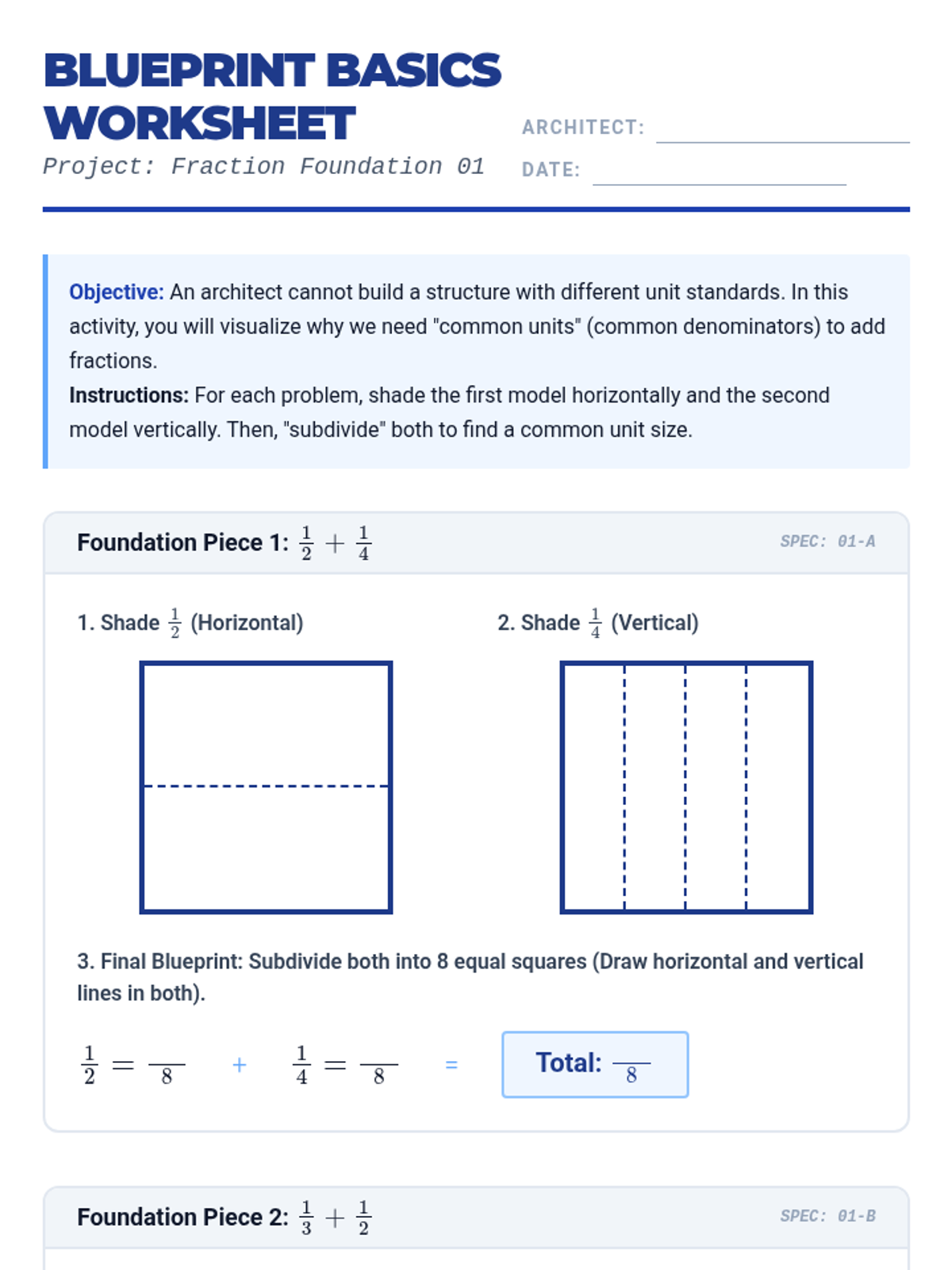 A comprehensive 6th-grade math sequence exploring the conceptual and procedural foundations of adding and subtracting fractions with unlike denominators through a 'Blueprint Architects' theme. Students progress from visual modeling to mastery of the standard algorithm and simplification.