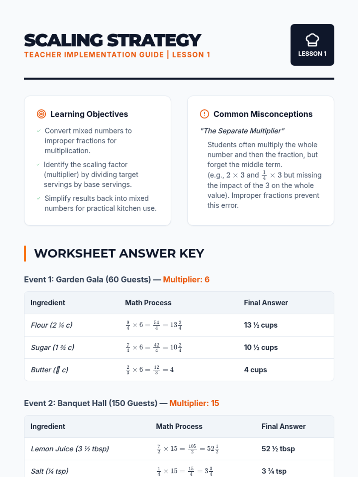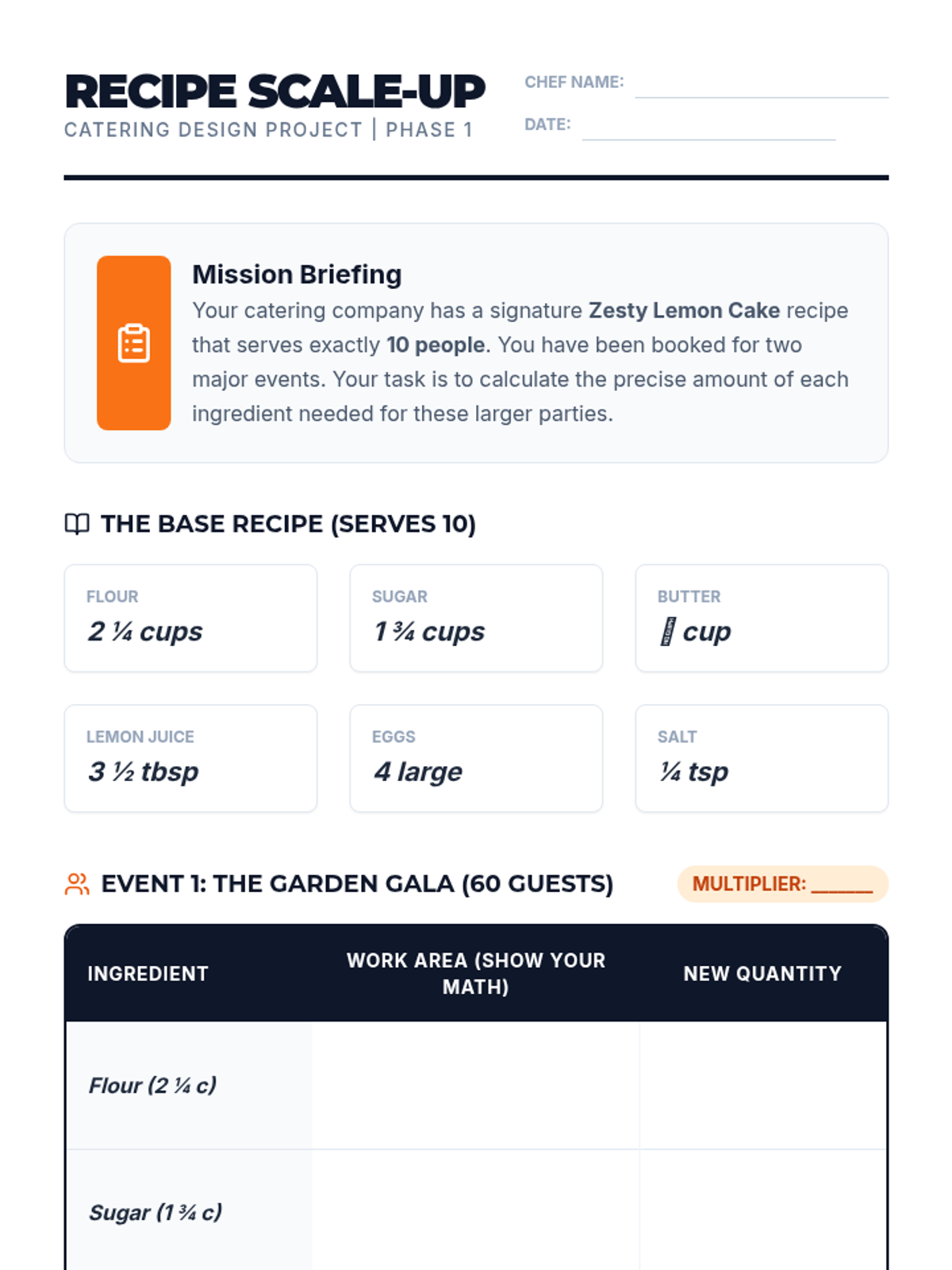 A 7th-grade math project-based sequence where students apply fraction multiplication and division to manage a catering business, from scaling recipes to cost analysis and final event bidding.