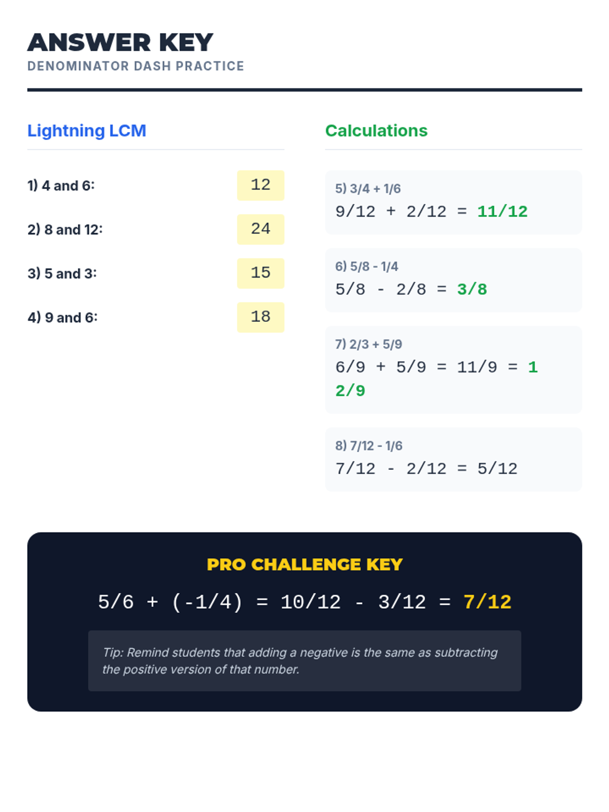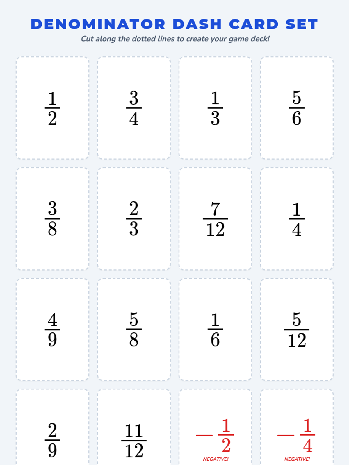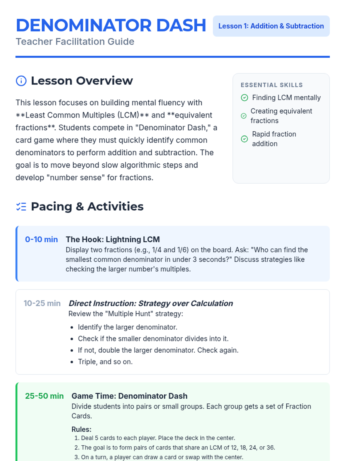 A high-energy series of 7th-grade math lessons focusing on fluency with rational fraction operations through games, puzzles, and competitive challenges. Students master addition, subtraction, multiplication, and division of signed fractions and mixed numbers.