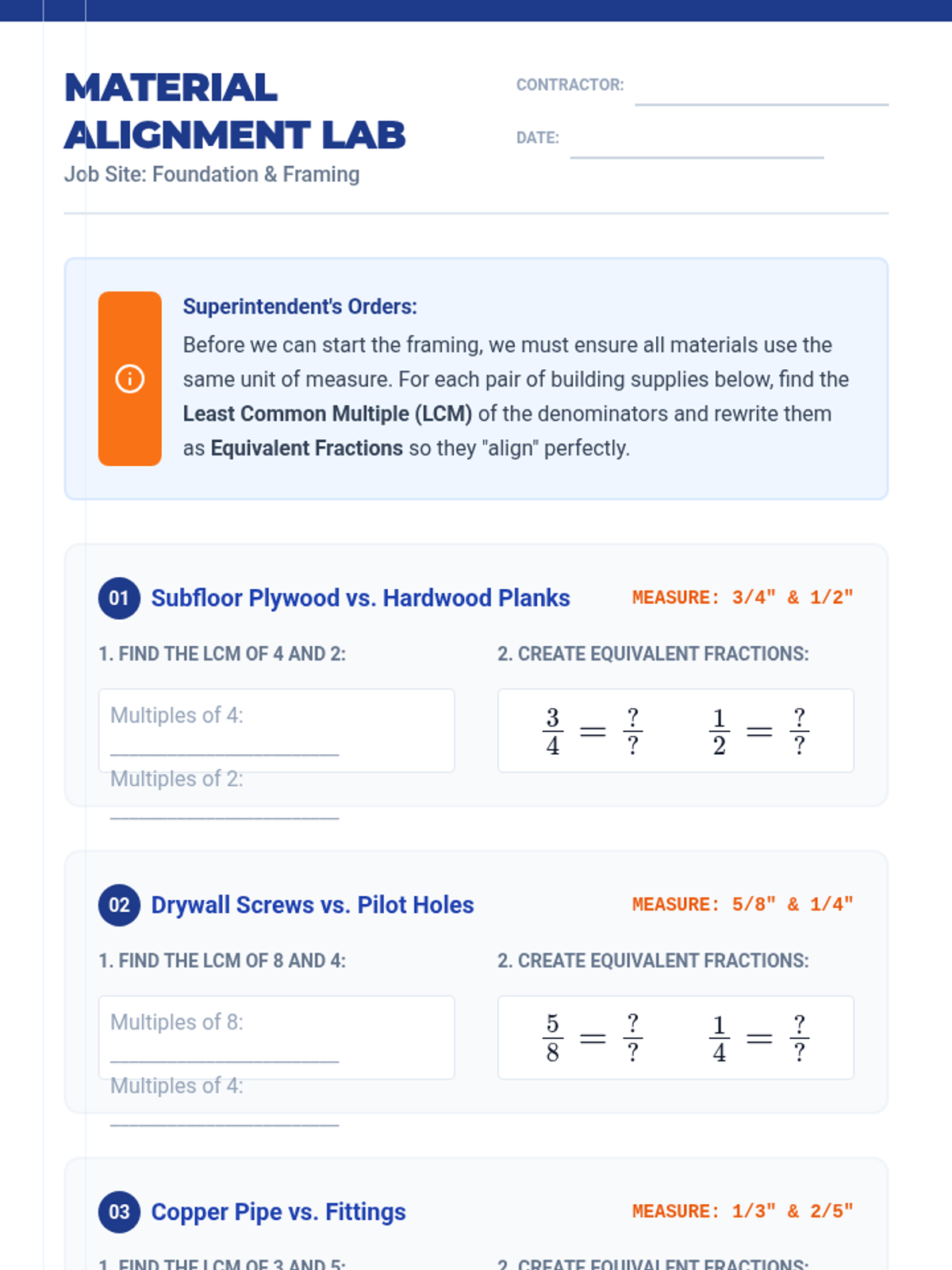 A 7th-grade math unit where students act as contractors to master adding and subtracting fractions and mixed numbers through the lens of home renovation and construction projects.