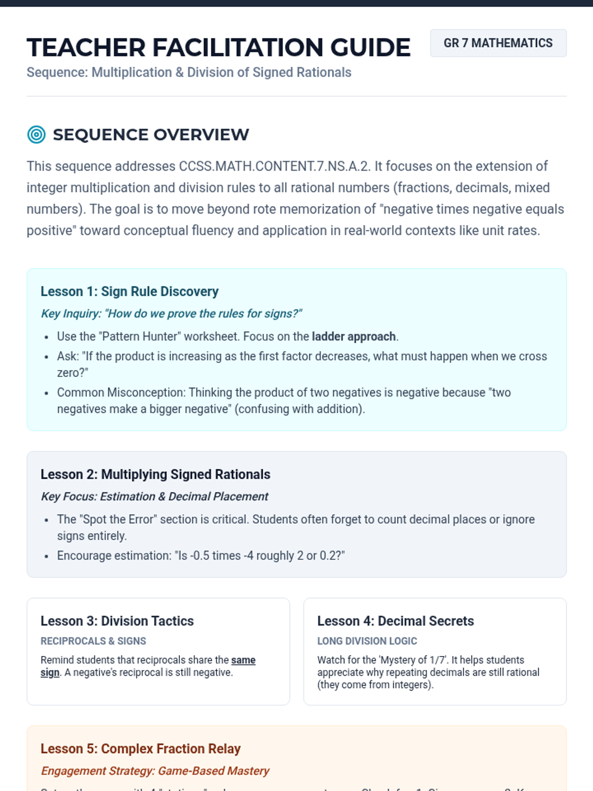 A specialized intervention sequence for 7th grade students focusing on multiplying and dividing rational numbers. This sequence emphasizes visual models, sign rules, and real-world application of decimal conversion.
