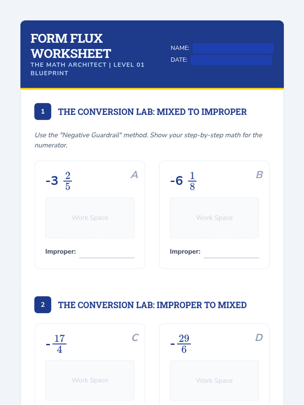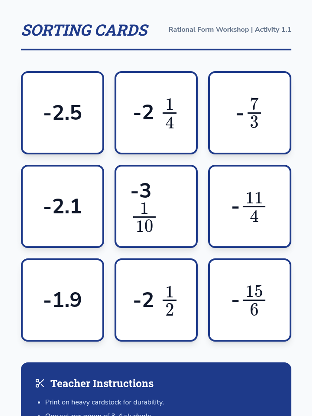 A comprehensive sequence for 7th-grade students focused on building procedural fluency with mixed numbers and improper fractions, including negative values. Students will learn to navigate between forms, apply regrouping strategies, and choose the most efficient methods for multi-step rational number operations.