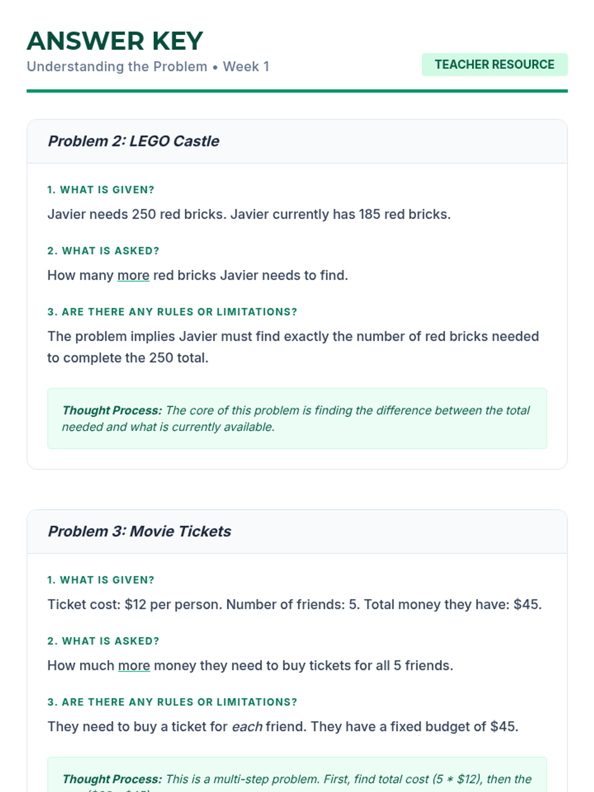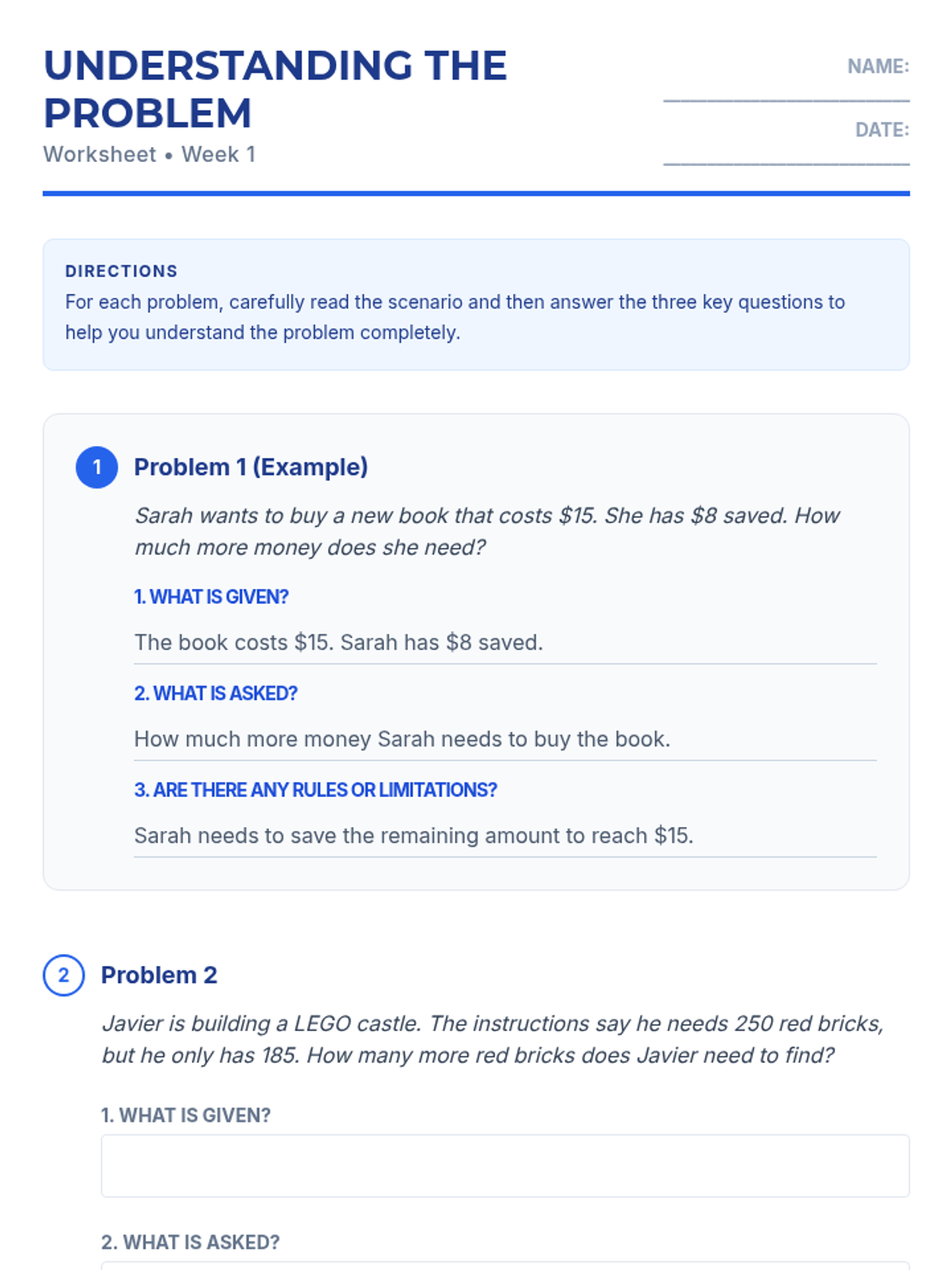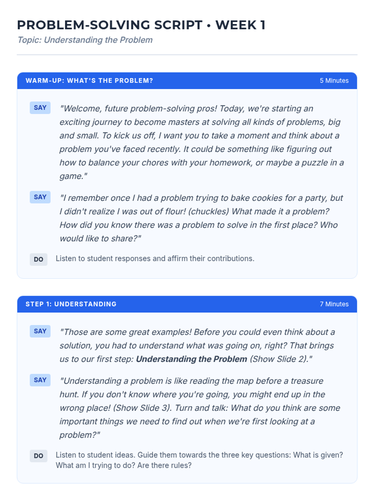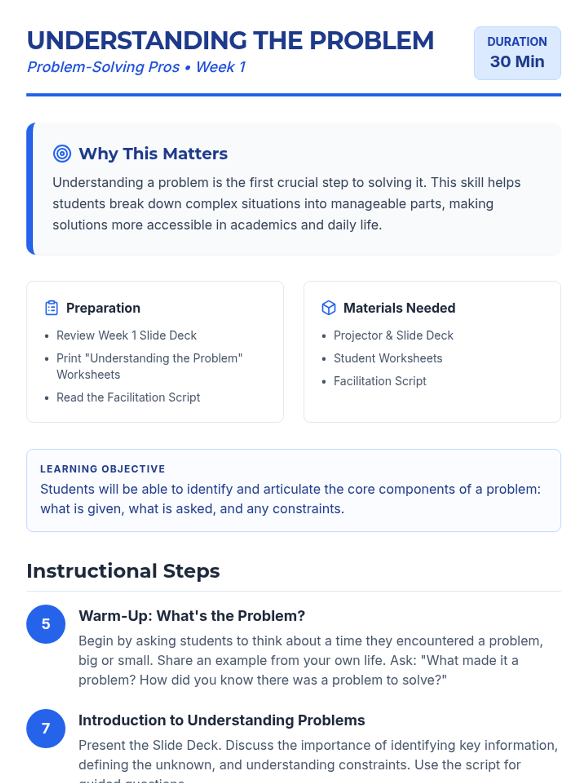 A ten-week Tier 2 intervention program for 7th graders focused on Polya's four-step problem-solving process and specific mathematical strategies. Each session is designed for 30 minutes and includes visual instruction, guided practice, and independent reflection.
