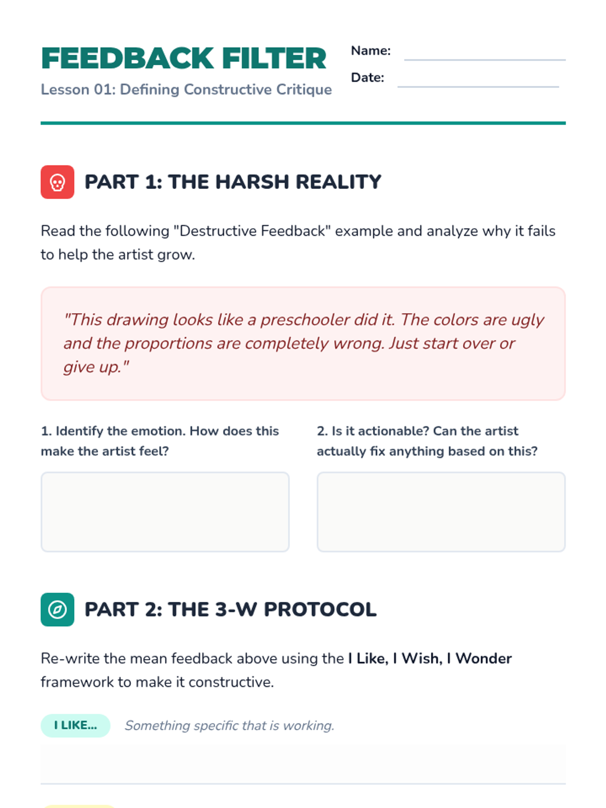 A comprehensive sequence for 8th-grade students focused on the transformative power of feedback in the arts. Students progress from learning constructive critique protocols to conducting peer workshops, filtering feedback, and iteratively refining their work for a final process-focused portfolio presentation.
