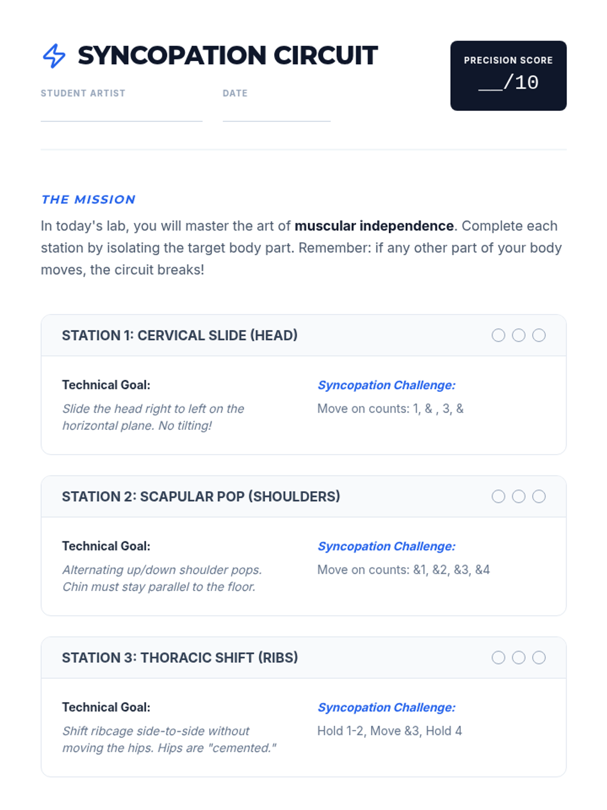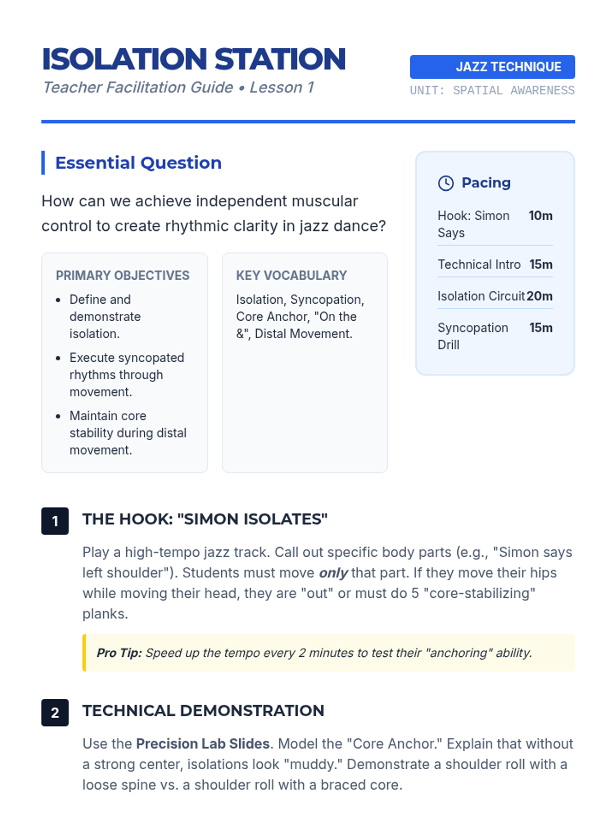 This 8th-grade dance sequence explores the technical foundations of jazz and contemporary dance, focusing on spatial awareness, body isolations, and the mechanics of weight shift. Students progress from micro-movements to full-body traveling sequences, culminating in a collaborative choreography project.
