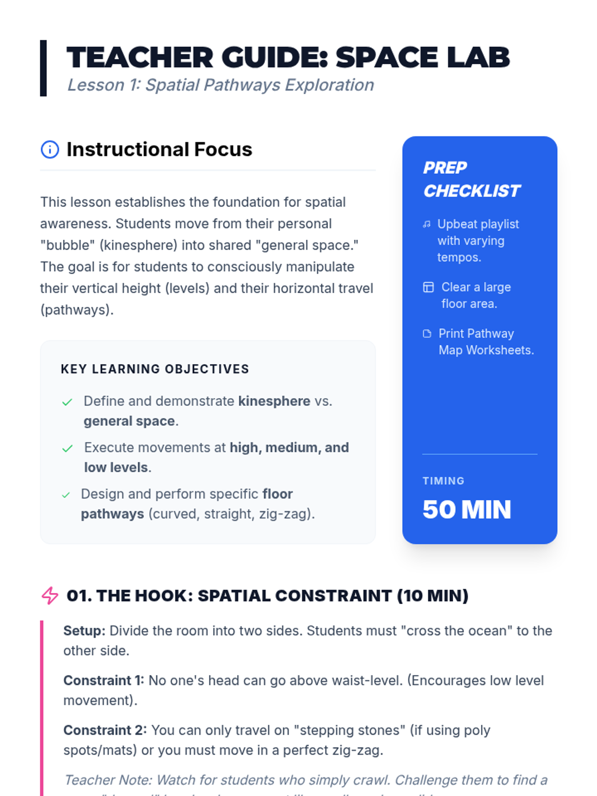 A comprehensive 8th-grade dance unit exploring the core elements of movement: space, time, and energy. Students progress from individual movement exploration to collaborative choreography, culminating in a performance and peer analysis.
