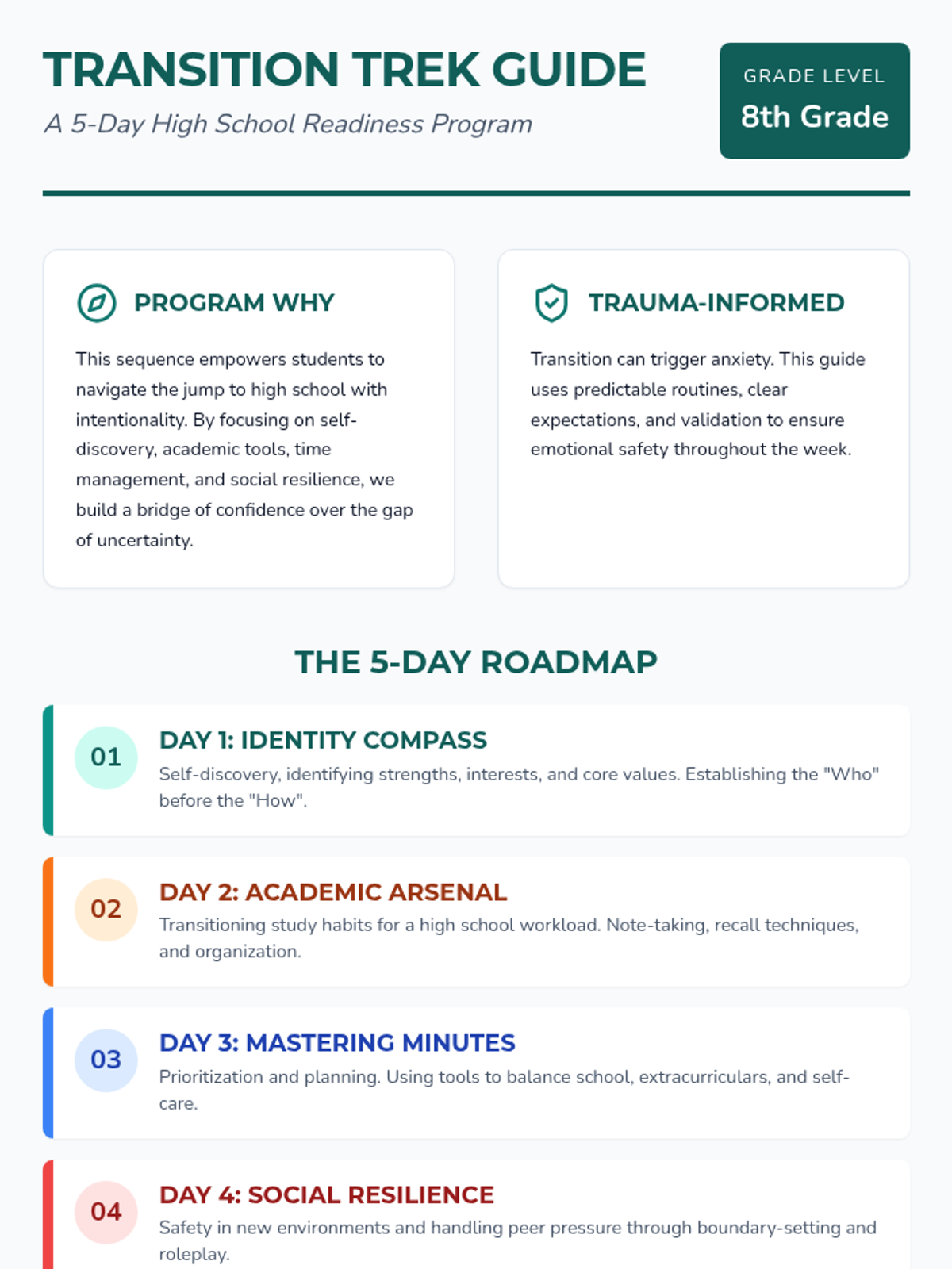 College selection, application workflows, and financial aid navigation including FAFSA and scholarship acquisition. Builds skills in personal statement writing and career exploration to align post-secondary choices with long-term professional goals.