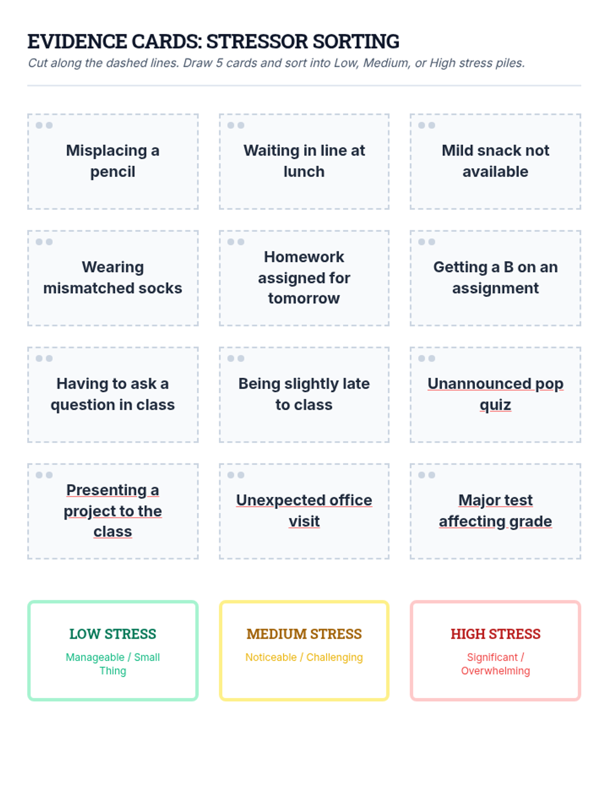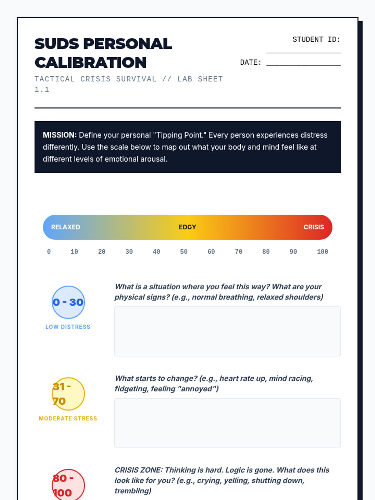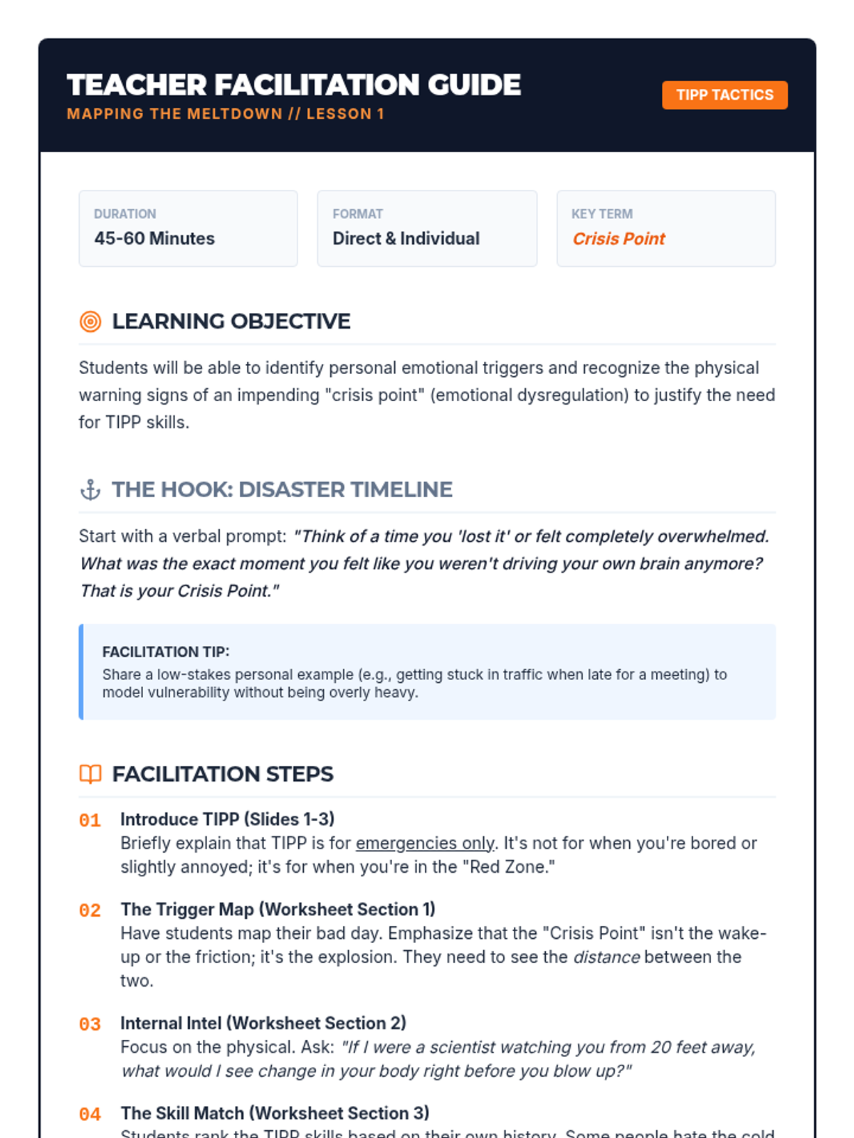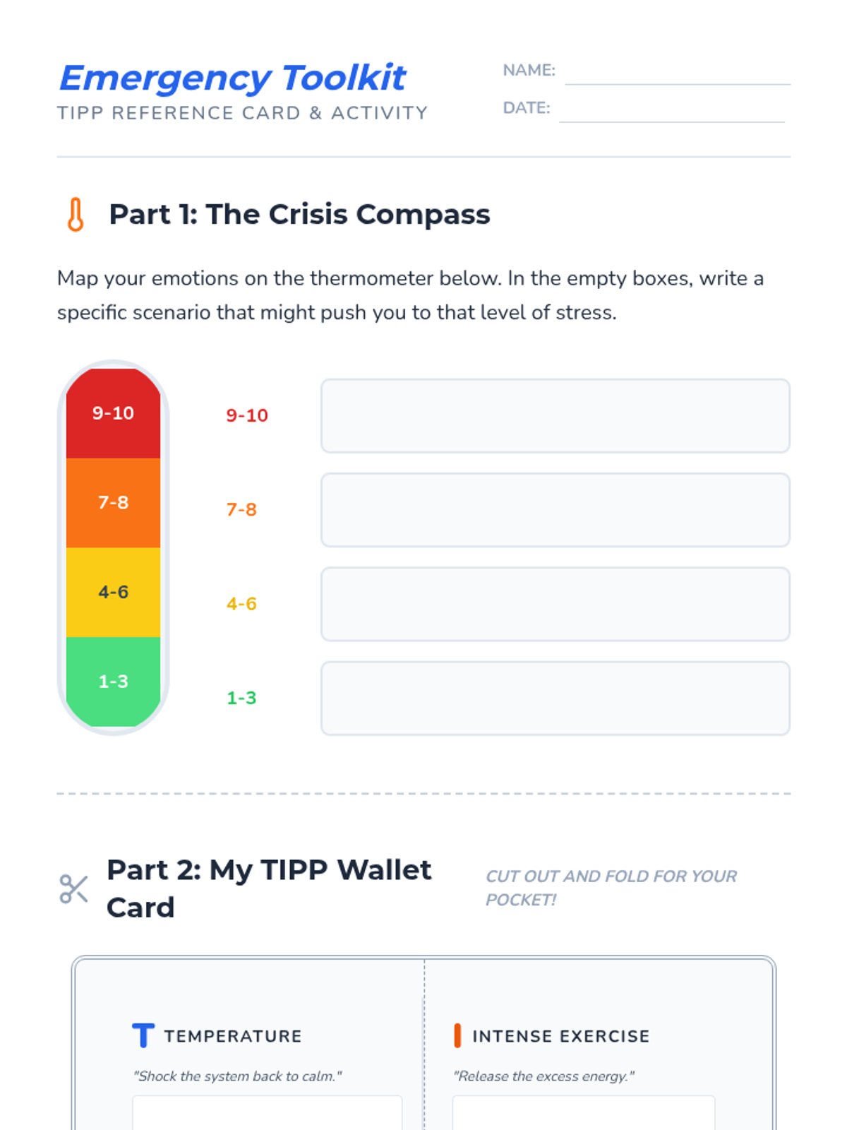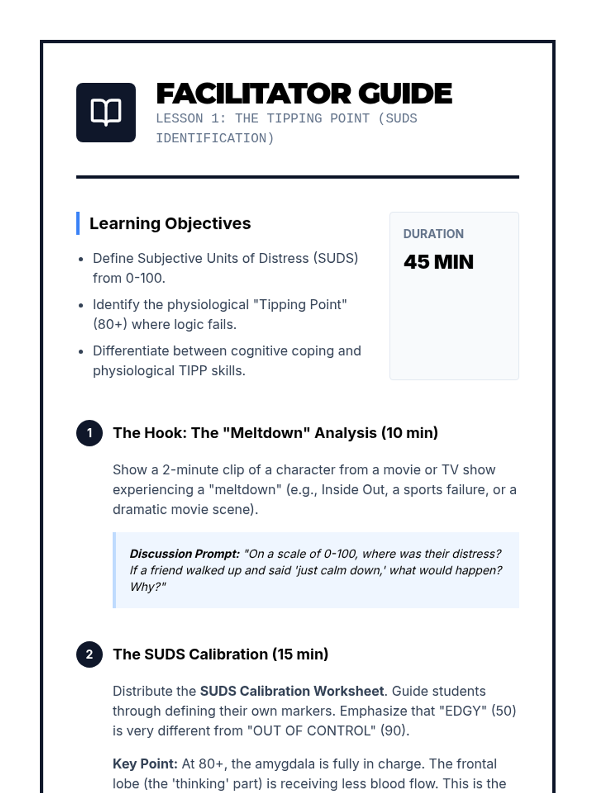 A comprehensive sequence designed for 8th-grade students to master the TIPP crisis survival skills. Students move from understanding physiological distress levels (SUDS) to analyzing complex academic and social scenarios, ultimately creating decision-making tools to manage high-arousal emotional states effectively.
