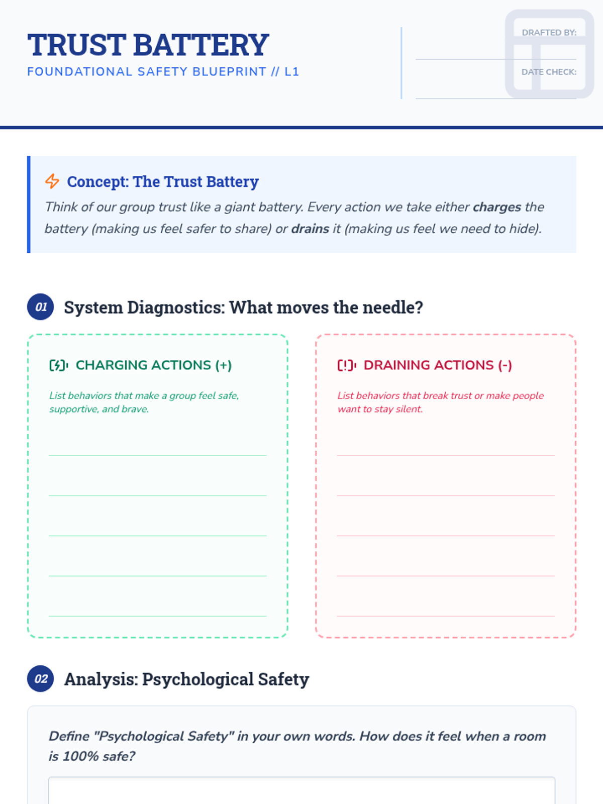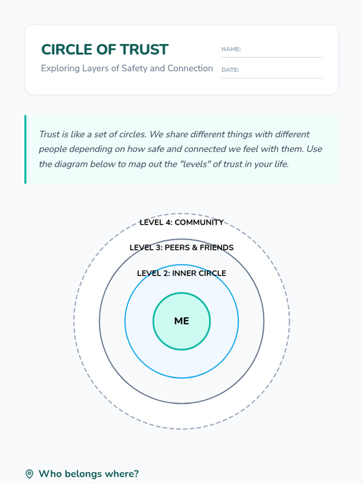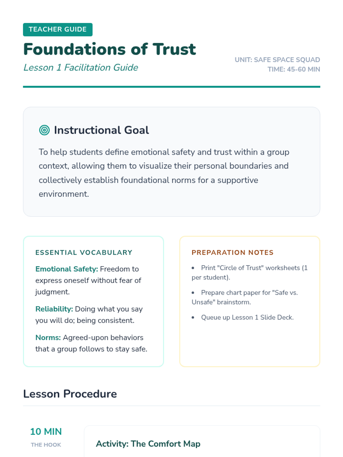 A 5-lesson sequence for 6th-grade students focused on building a supportive group environment. Students will explore trust, distinguish between vulnerability and oversharing, understand the ethical limits of confidentiality, practice inclusive behaviors, and collaboratively draft a group support contract.
