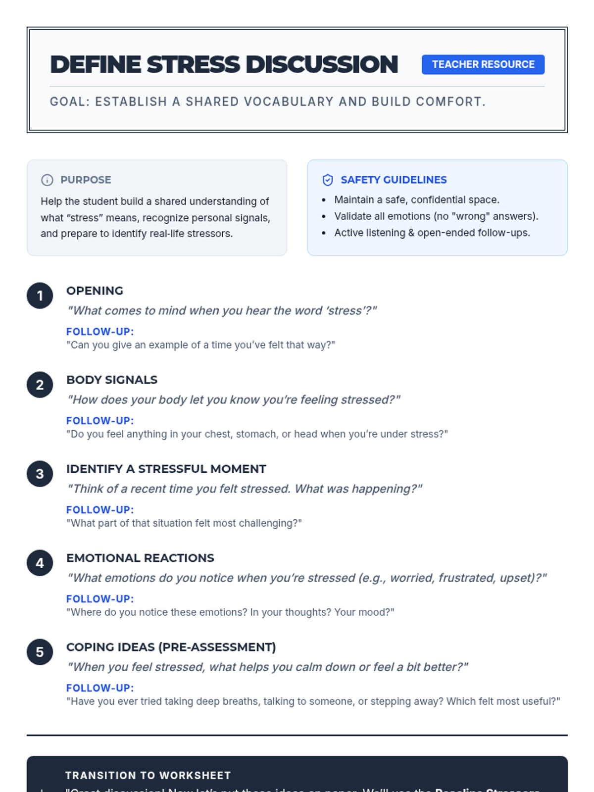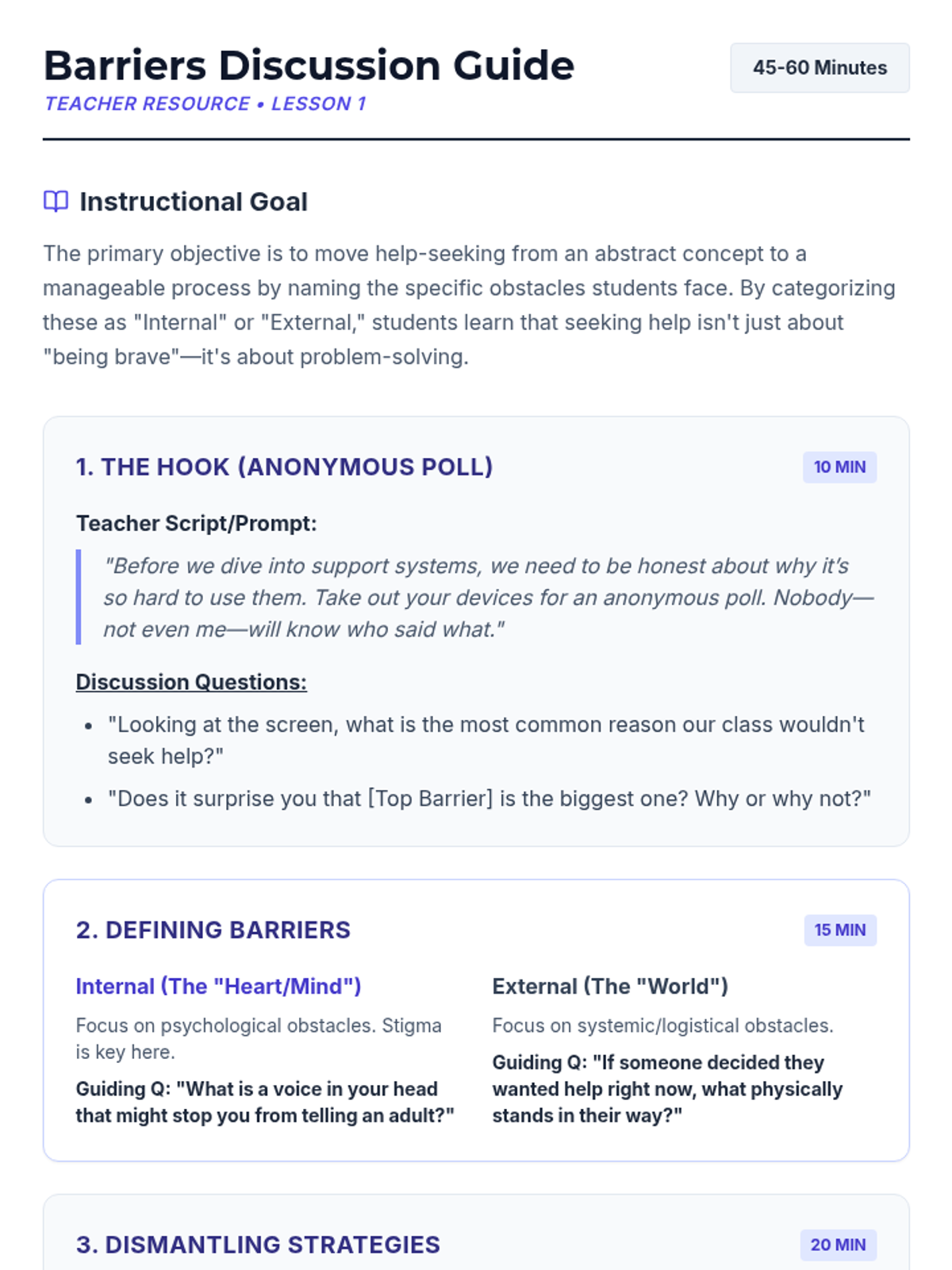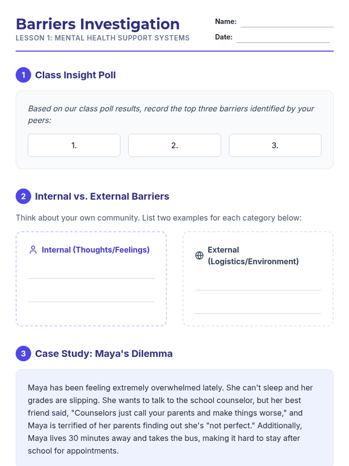 This 8th-grade sequence empowers students to overcome the psychological and logistical hurdles of seeking mental health help. Through barrier analysis, resource mapping, and verbal script practice, students build the literacy and confidence needed to advocate for themselves and their peers.