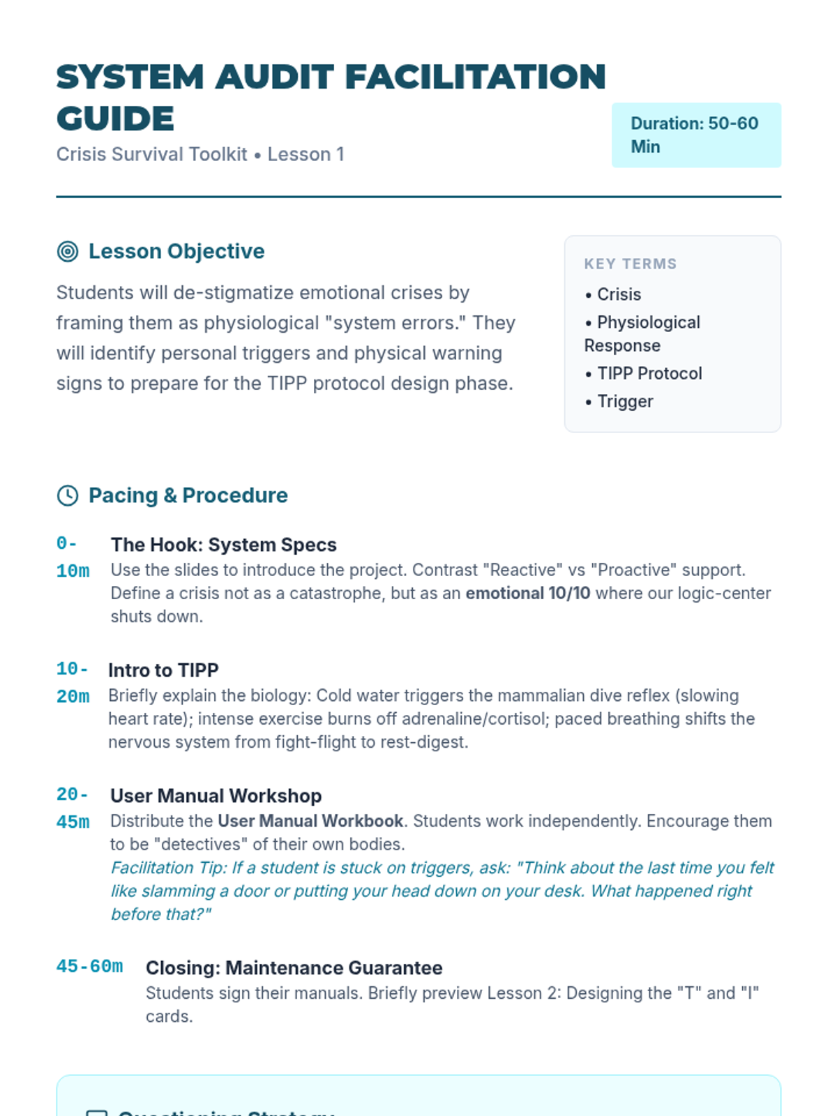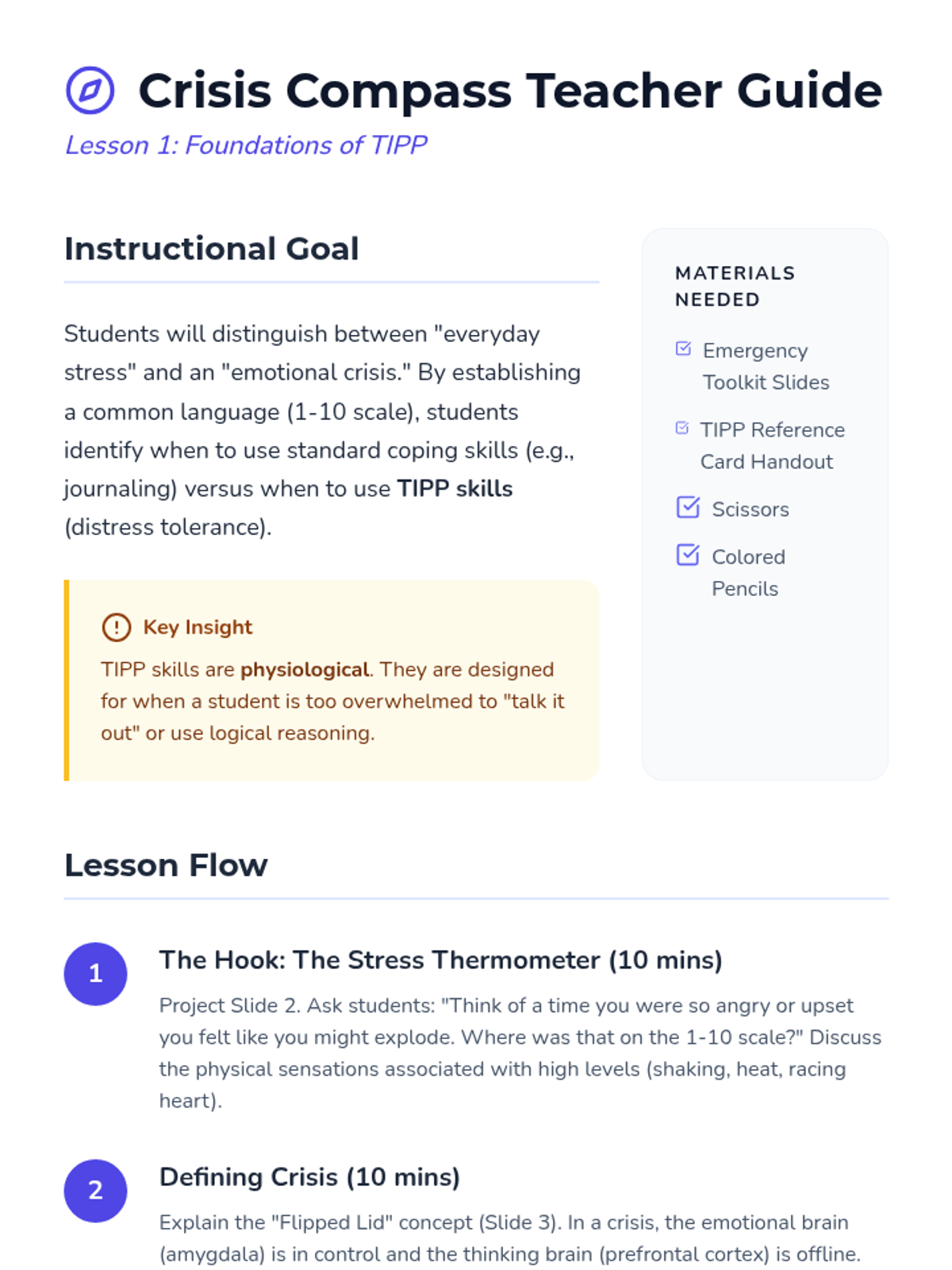 A project-based unit where 7th-grade students design and assemble personal 'Crisis Survival Kits' based on the TIPP skills (Temperature, Intense Exercise, Paced Breathing, and Paired Muscle Relaxation). Students move from self-audit to physical tool creation and final testing of their proactive mental health resources.