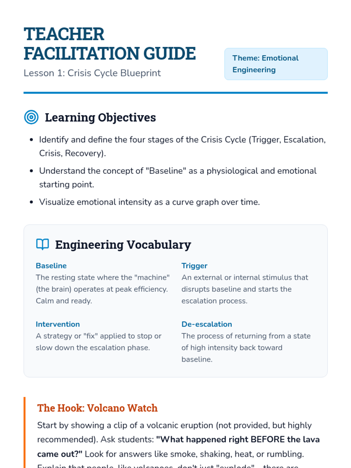 A comprehensive 5-lesson unit on the Crisis Cycle, focusing on identifying triggers, escalation stages, and intervention points through a technical mapping and simulation lens. Students move from theoretical understanding to retroactive detective work to understand behavioral patterns.