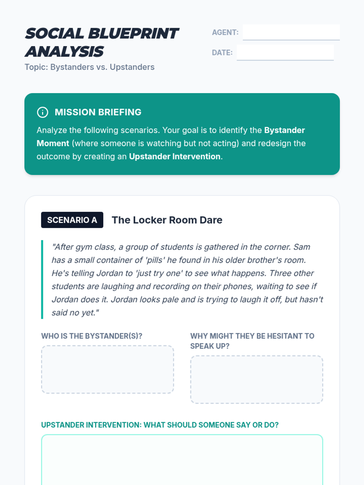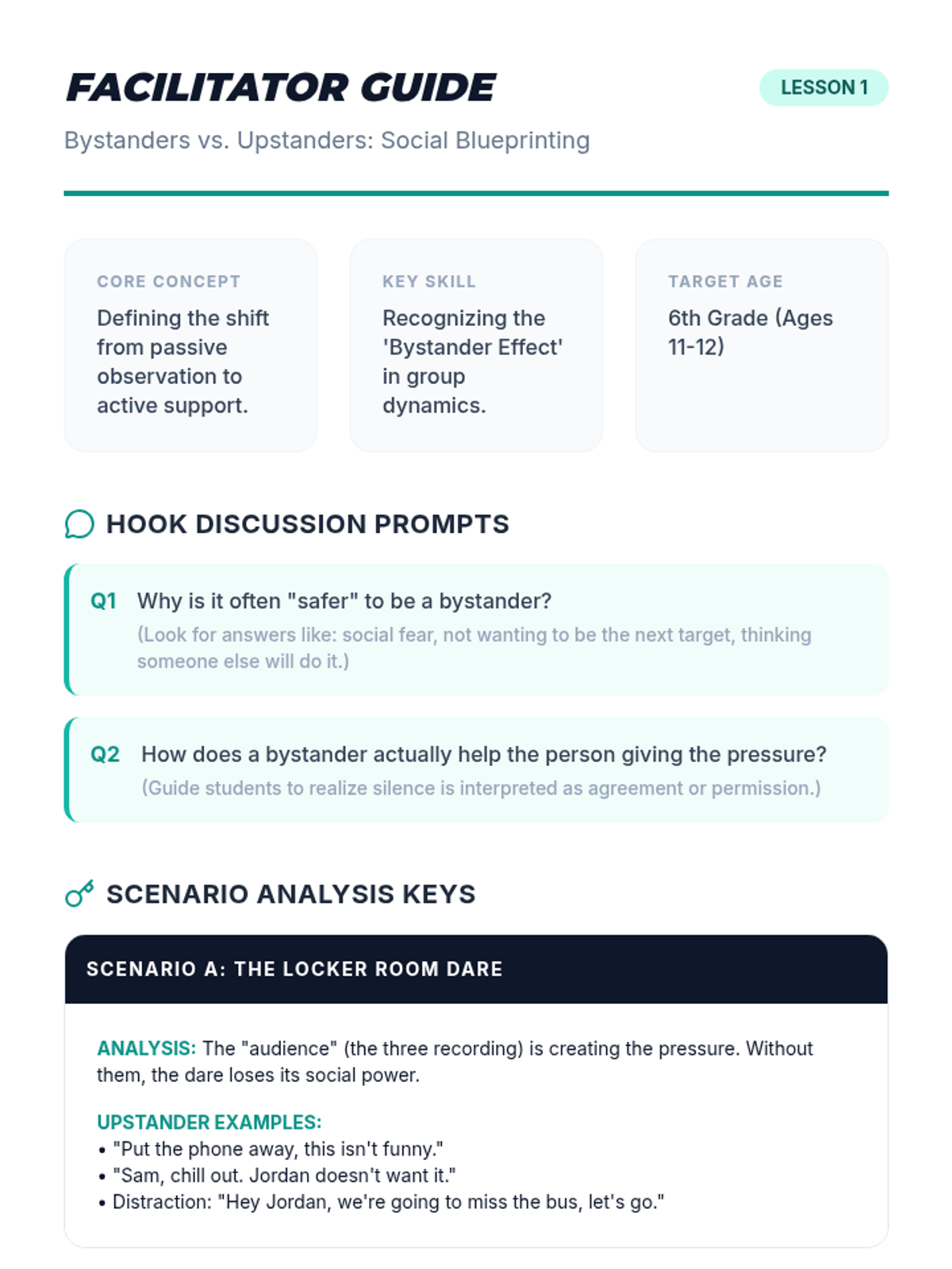 A comprehensive 6th-grade sequence focused on shifting peer culture from negative pressure to positive support. Students evolve from passive bystanders to active upstanders, learning techniques to support peers and leverage positive influence to create a healthier community.