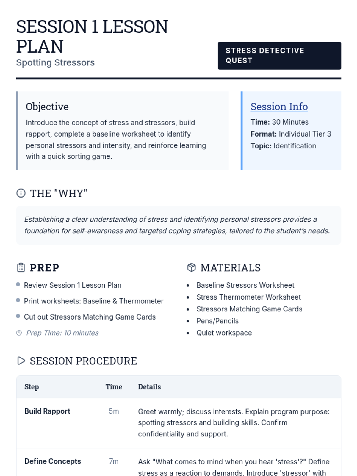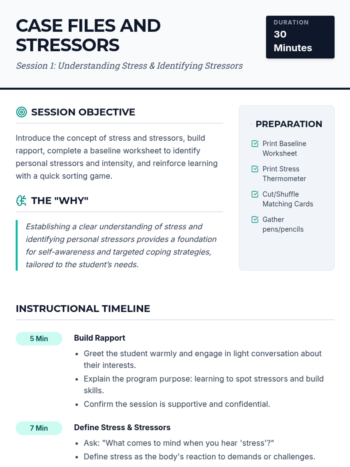 A 6-week small group curriculum for middle schoolers to investigate and manage anxiety through the 'Worry Detectives' lens, covering body clues, triggers, stealth calm techniques, and truth-checking.
