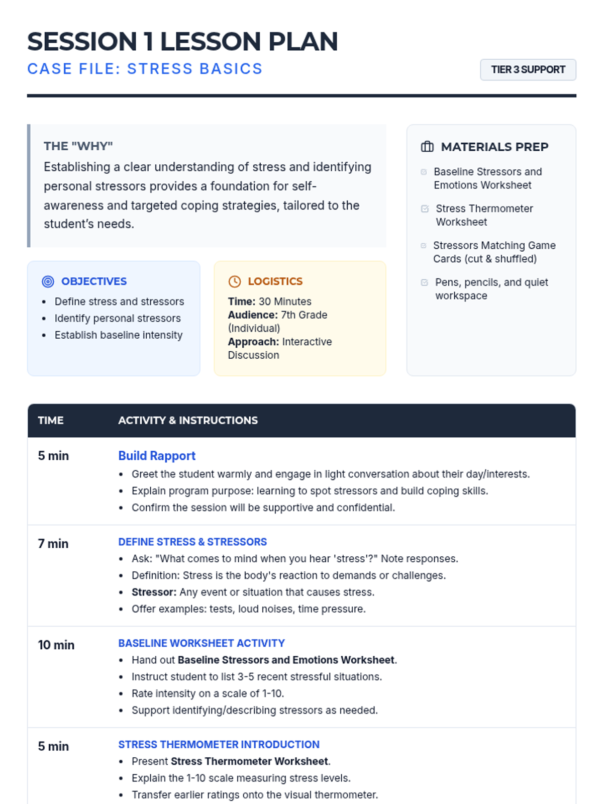 A 10-session Tier 3 intervention for a 7th-grade student with a seizure history, focusing on identifying stressors, physical cues, and building evidence-based coping resilience.