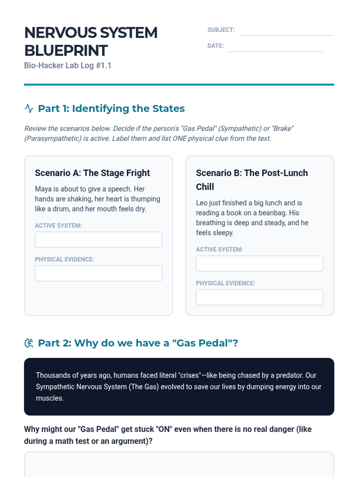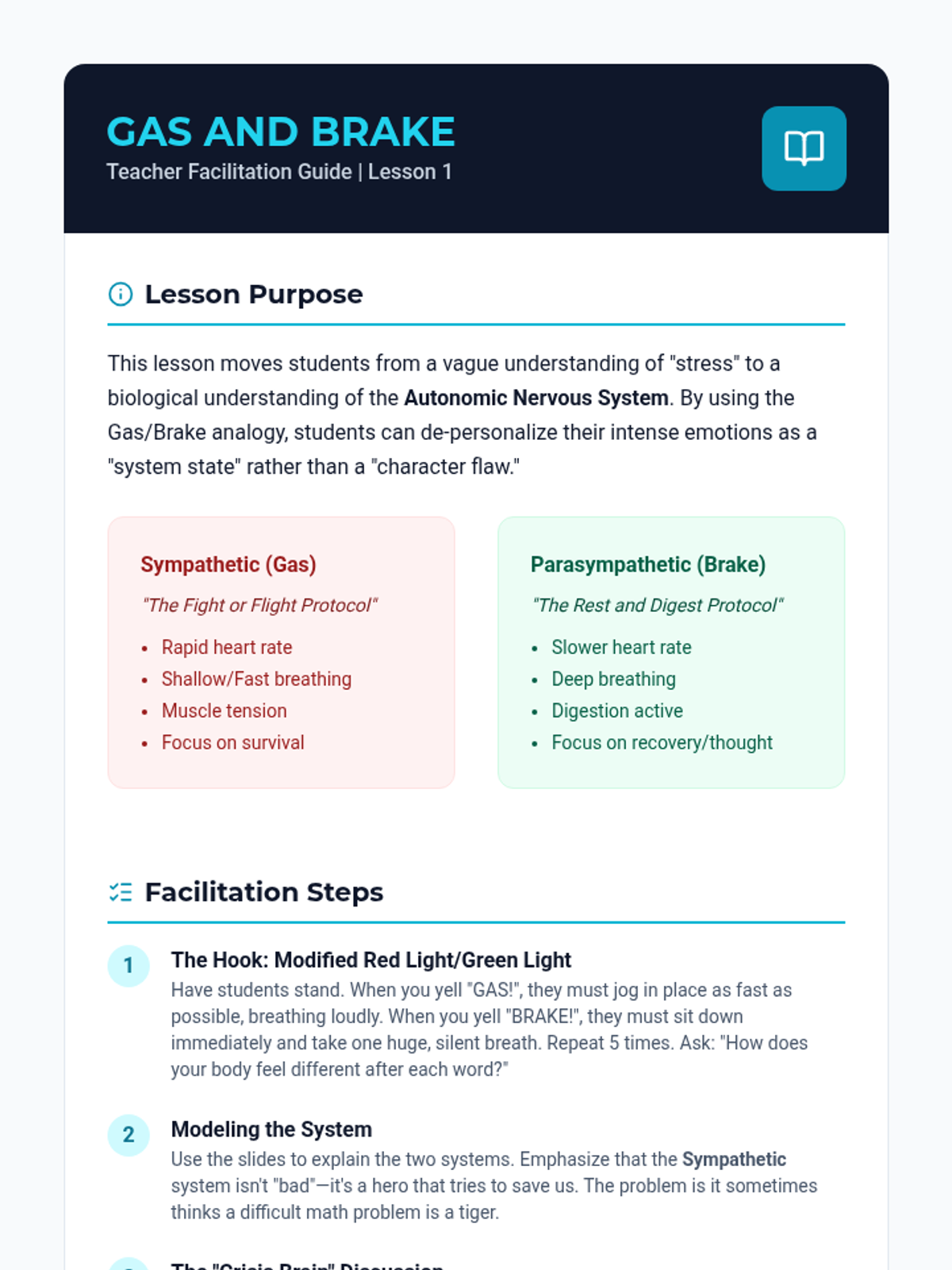 This inquiry-based sequence explores the biological 'why' behind TIPP skills, reframing them as 'bio-hacks' for the nervous system. Students investigate the autonomic nervous system, the Mammalian Dive Reflex, and the chemistry of stress to understand how physical interventions can regulate emotional states.