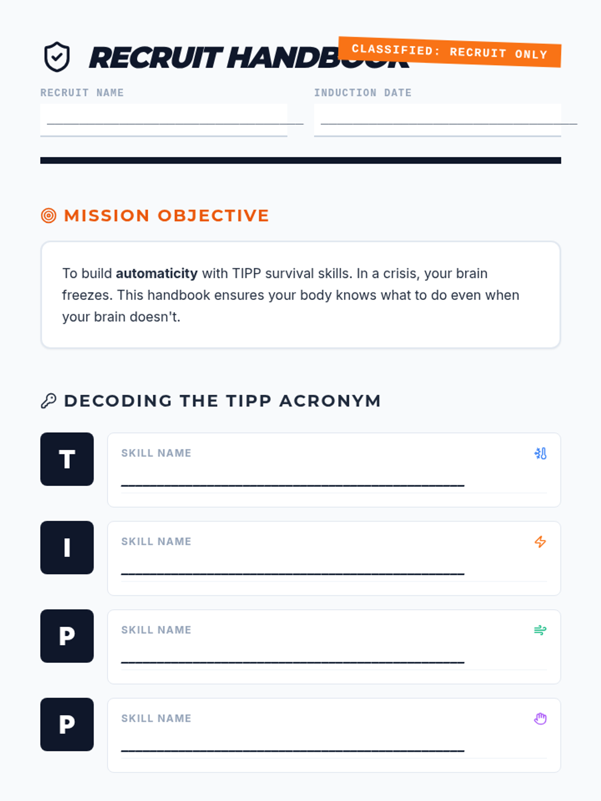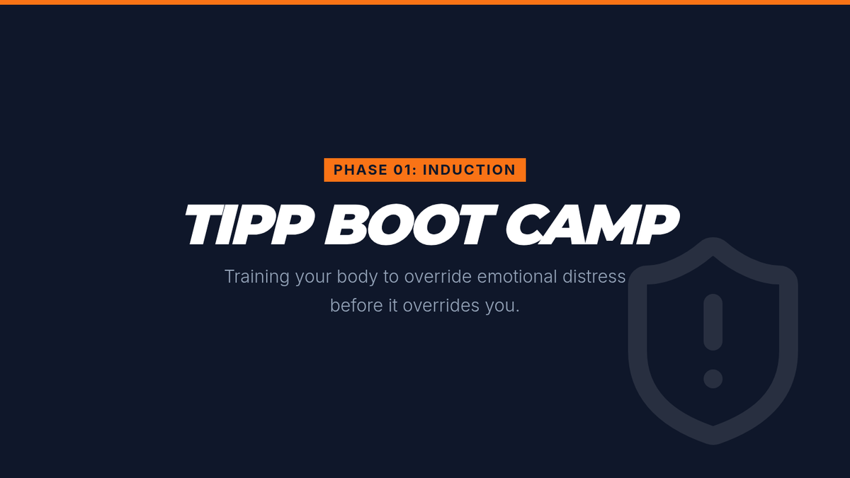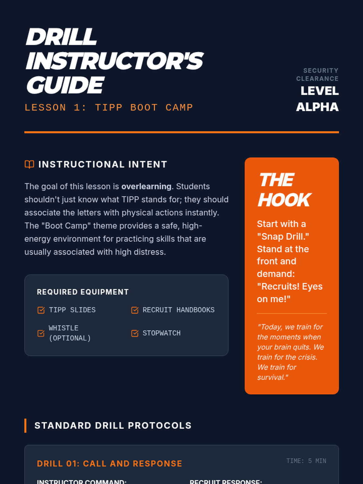 A gamified, mastery-based sequence designed to build automaticity with TIPP crisis survival skills. Students move through a 'Boot Camp' style curriculum, mastering Temperature, Intense Exercise, Paced Breathing, and Paired Muscle Relaxation through rapid-fire drills and simulations.
