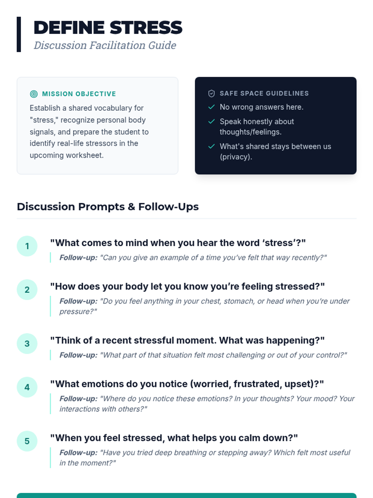 An actionable workshop sequence for 8th graders on recognizing mental health crises and applying the ACT (Acknowledge, Care, Tell) model to ensure peer safety. Students learn to overcome barriers to reporting and practice communicating urgency to trusted adults.