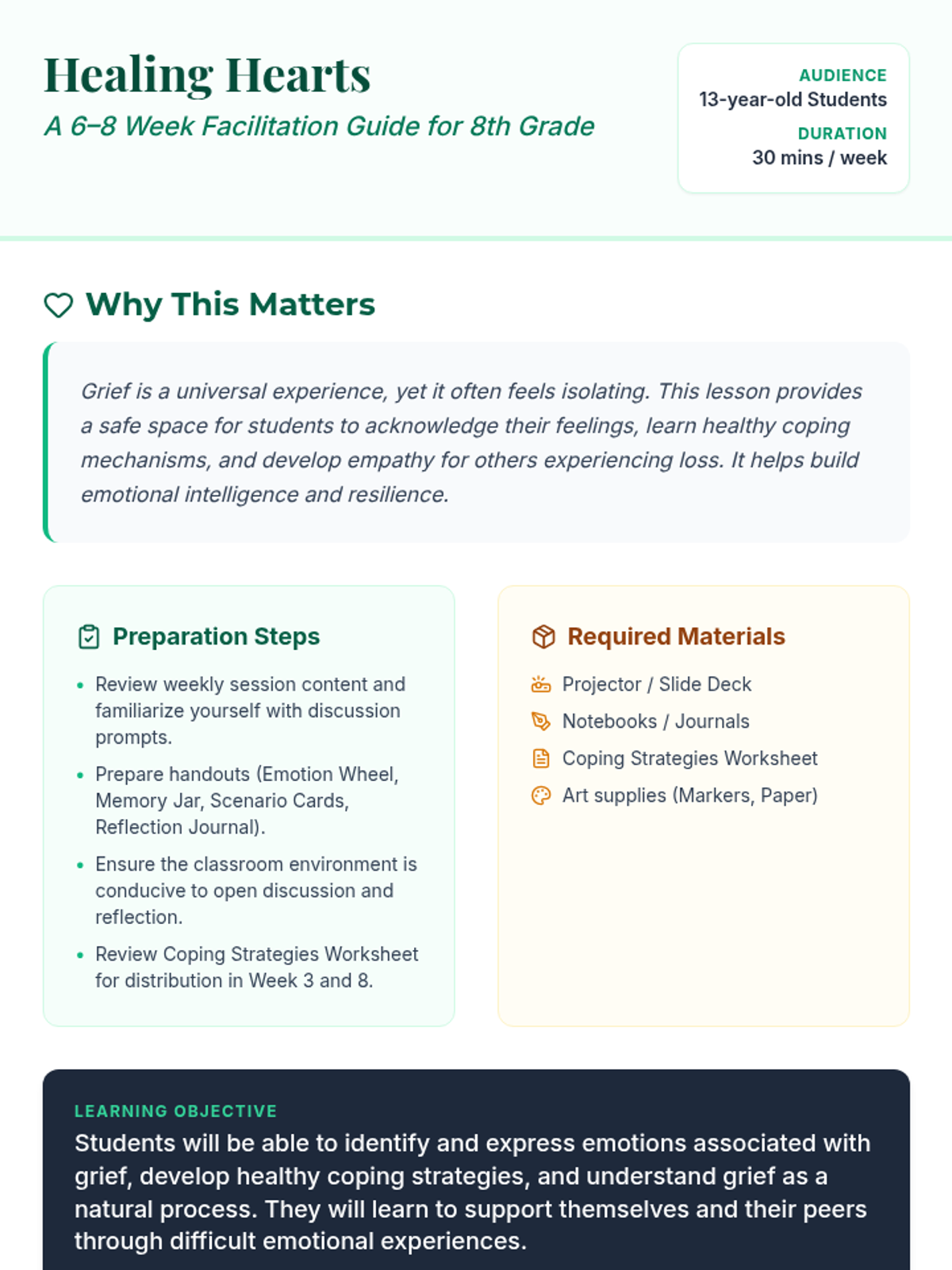 A 6-8 week social-emotional learning sequence for 8th-grade students to understand grief, develop coping strategies, and build resilience through supportive classroom discussions and activities.