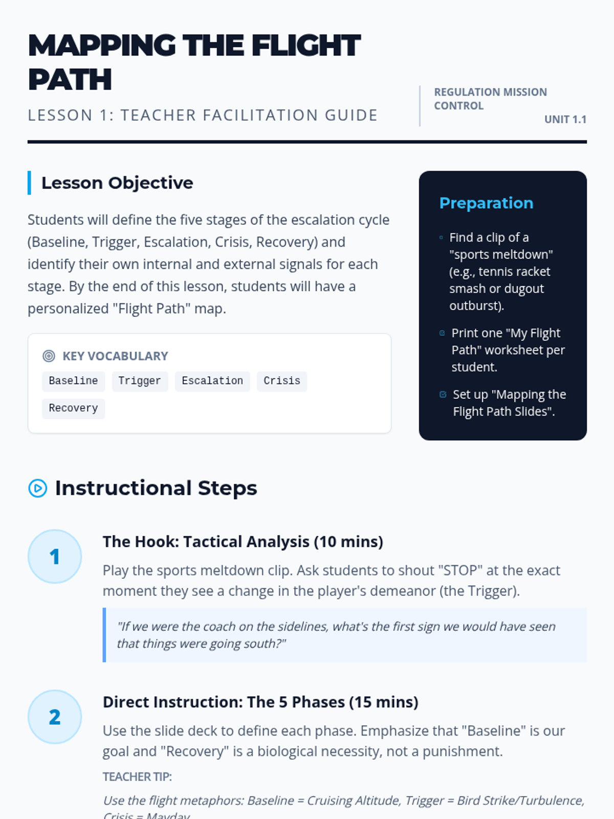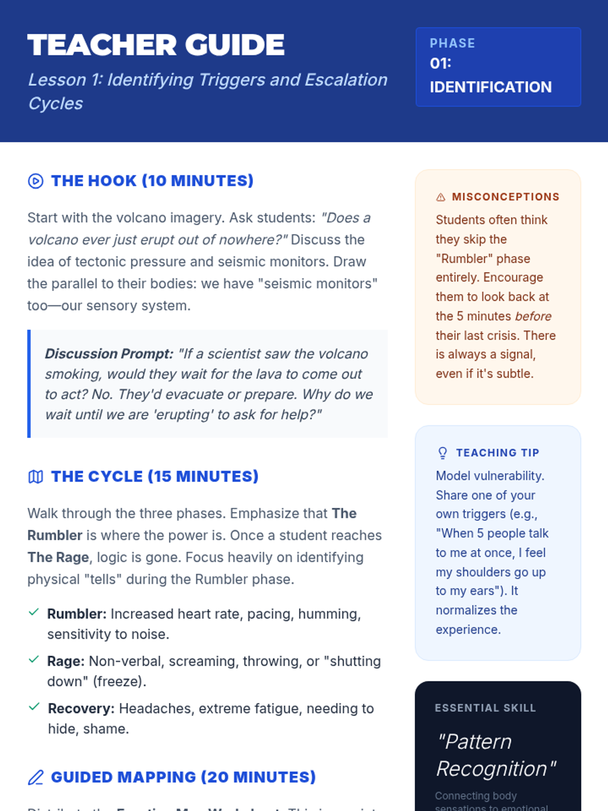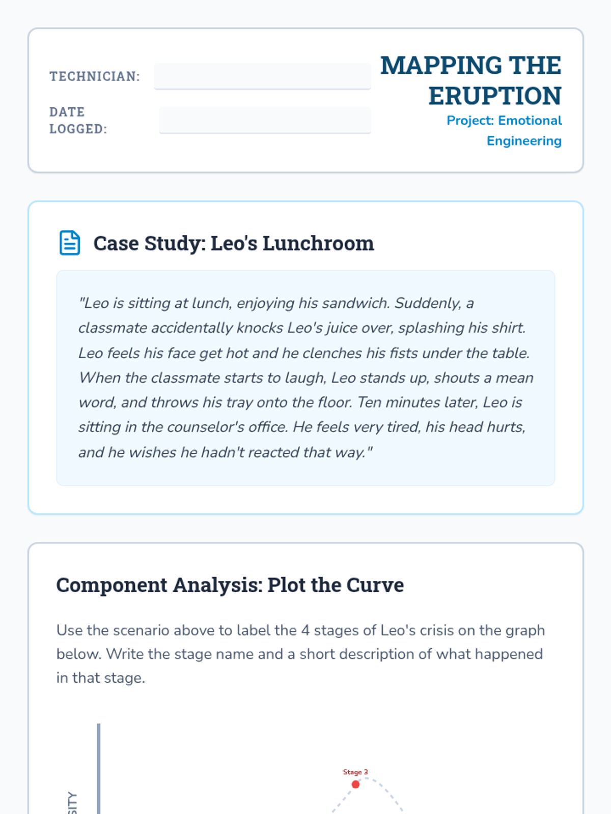 This 8th-grade sequence empowers students to analyze the mechanics of emotional dysregulation through a 'case study' lens. Students move from mapping the stages of a crisis to identifying hidden triggers and designing their own personal 'Crisis Prevention Plan' blueprints.