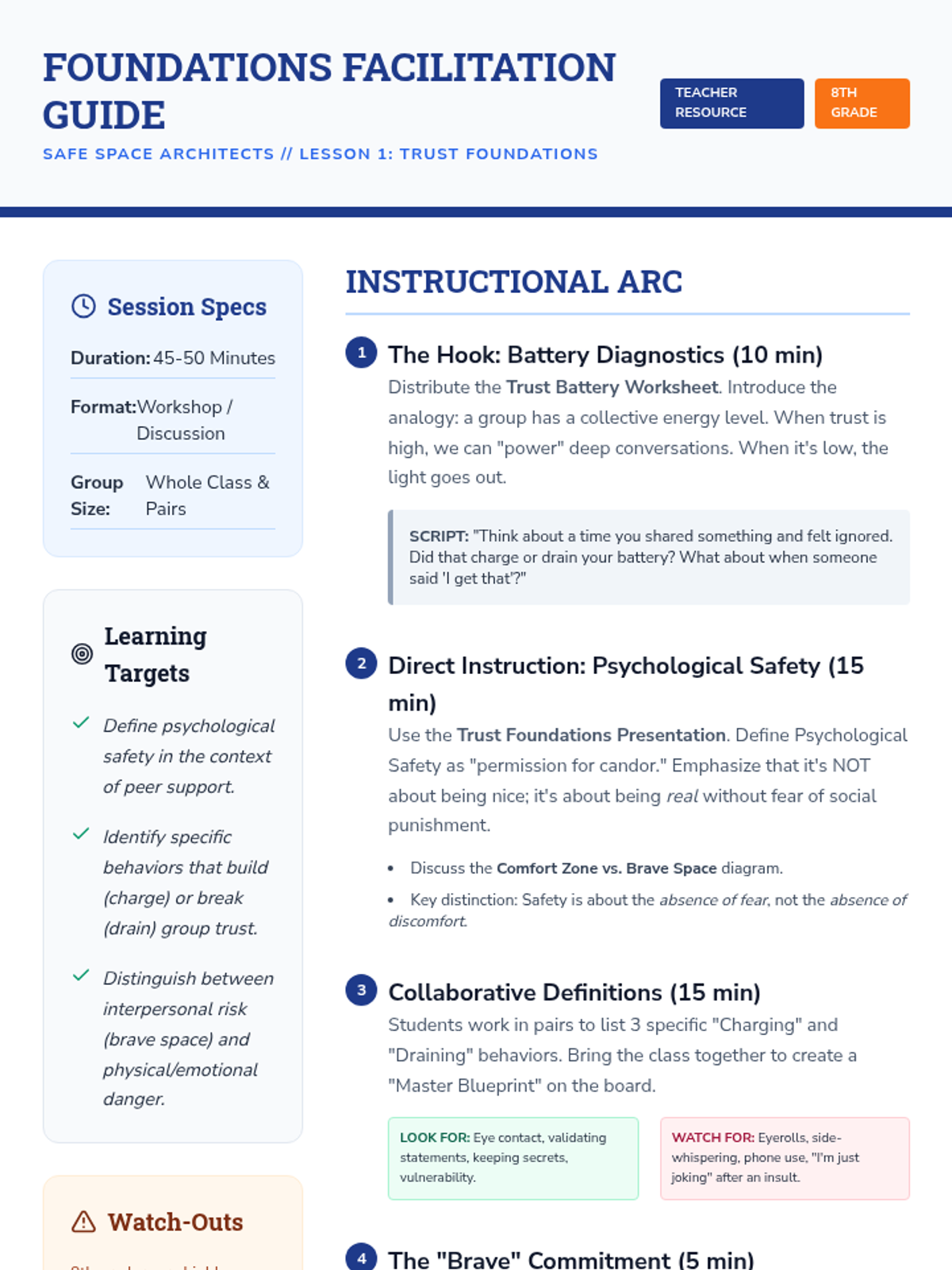 This sequence guides 8th-grade students through the ethics and mechanics of peer support groups. Students will learn to define psychological safety, navigate the complexities of confidentiality, distinguish between healthy vulnerability and oversharing, and practice non-judgmental responding, culminating in the creation of a formal group agreement.