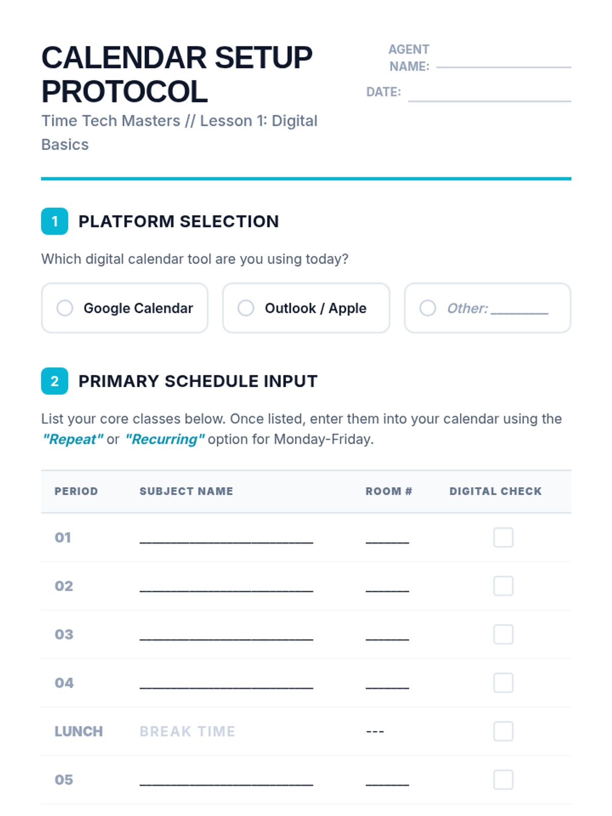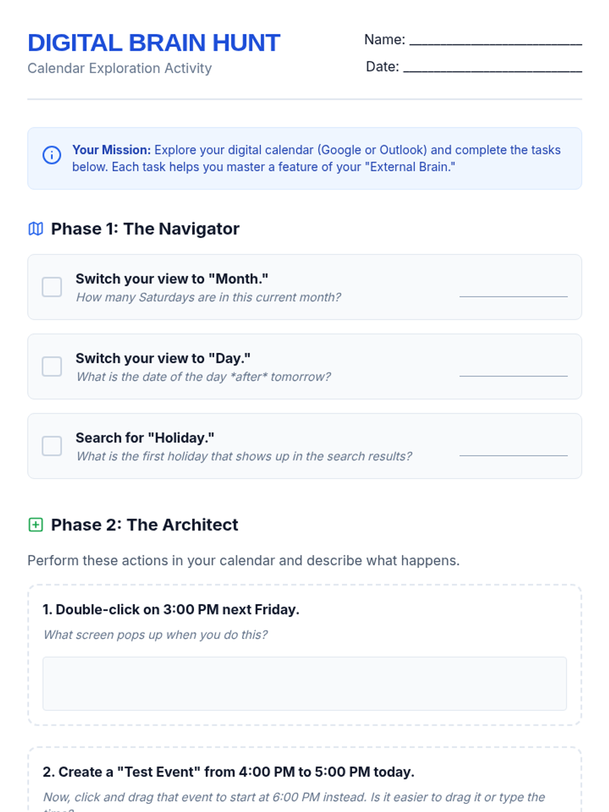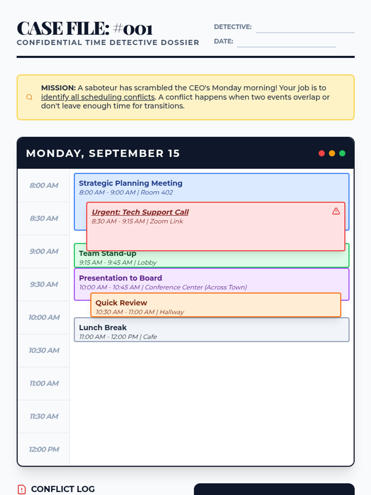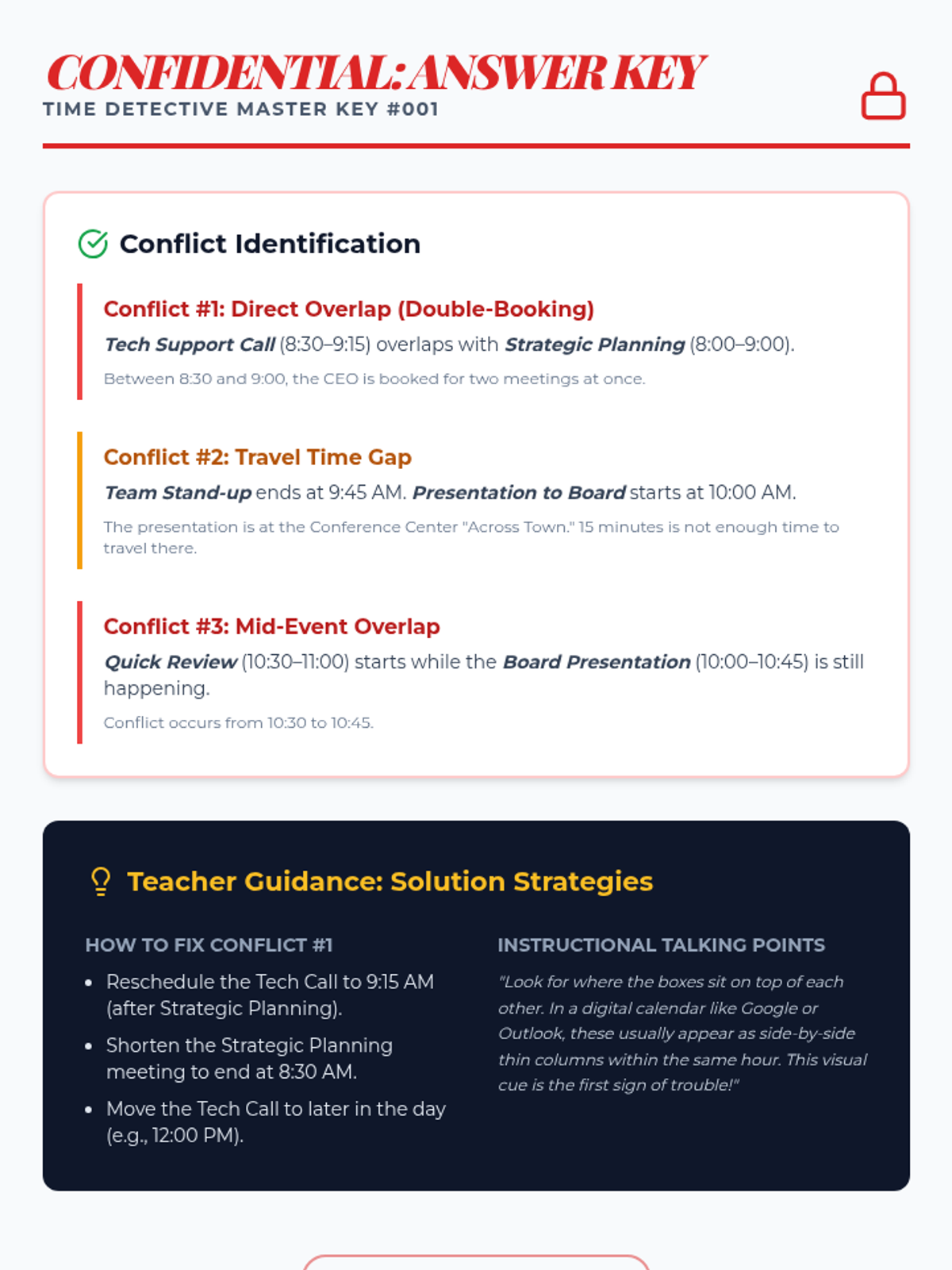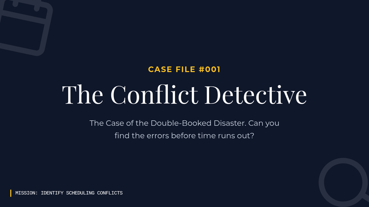 A game-based sequence where students act as 'Time Detectives' to master digital calendar skills. Through five interactive challenges, students learn to identify conflicts, adjust durations, manage locations, fix recurring patterns, and synthesize their skills into a master schedule.