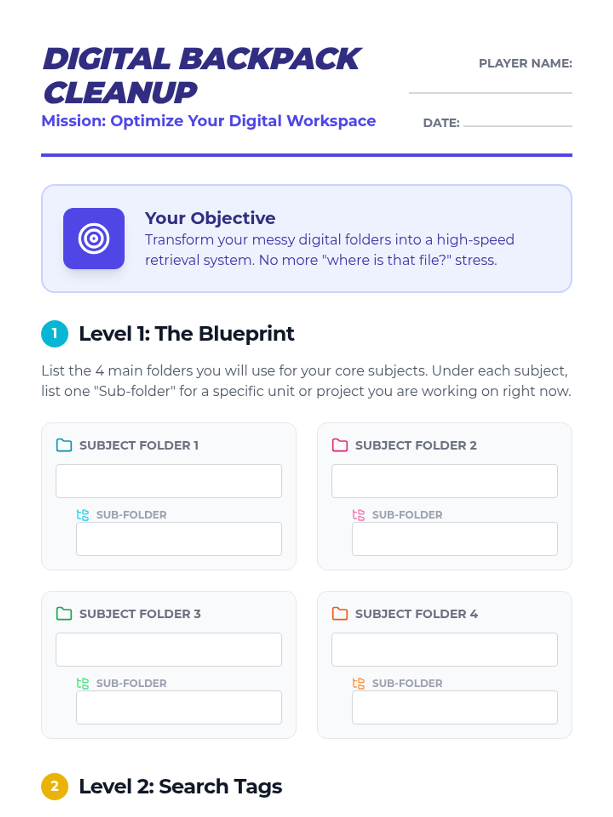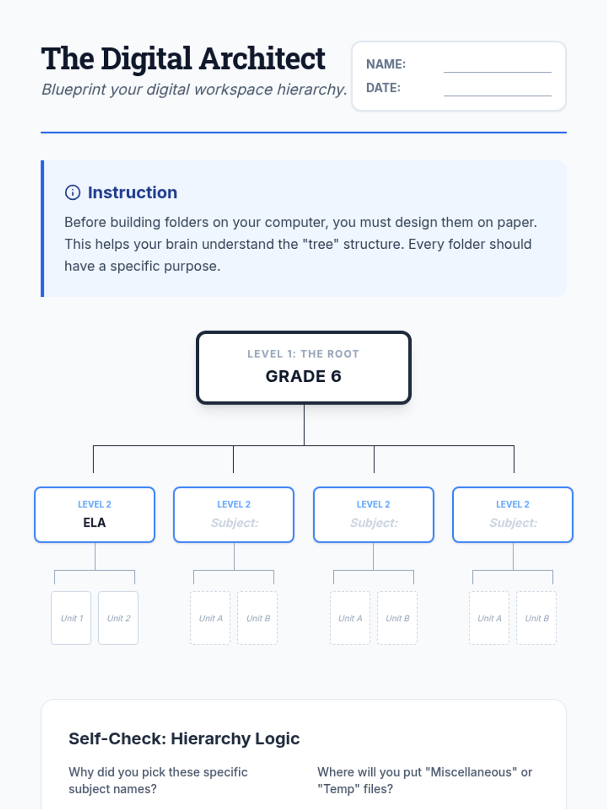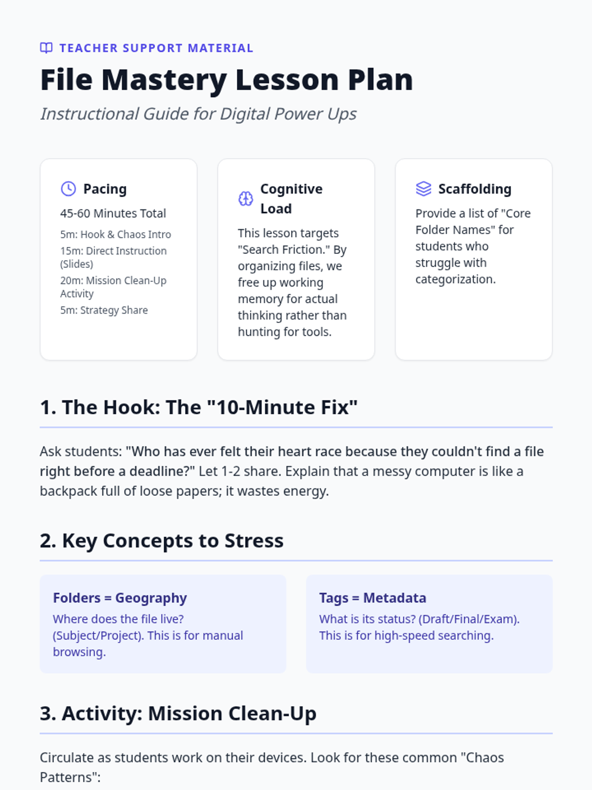 A 5-lesson unit for 6th-grade students focusing on digital organization and file management to reduce working memory load and improve academic efficiency. Students move from mapping folder hierarchies to establishing long-term digital hygiene routines.