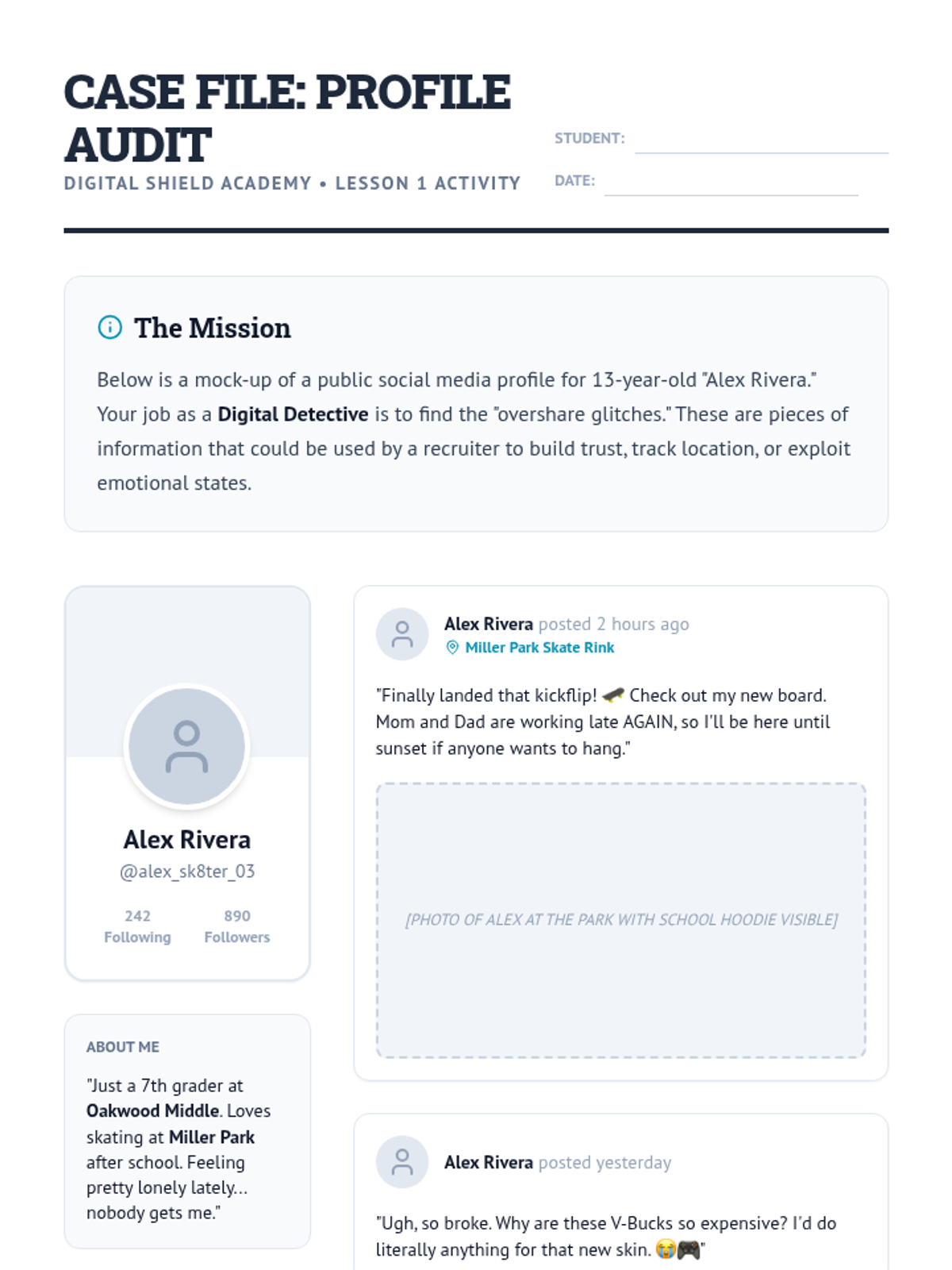 A comprehensive sequence for 7th-grade students focused on identifying and resisting online grooming and recruitment tactics used by traffickers. Students develop digital literacy skills to recognize fake profiles, manipulative lures, and unsafe gaming interactions while creating a personal digital defense protocol.