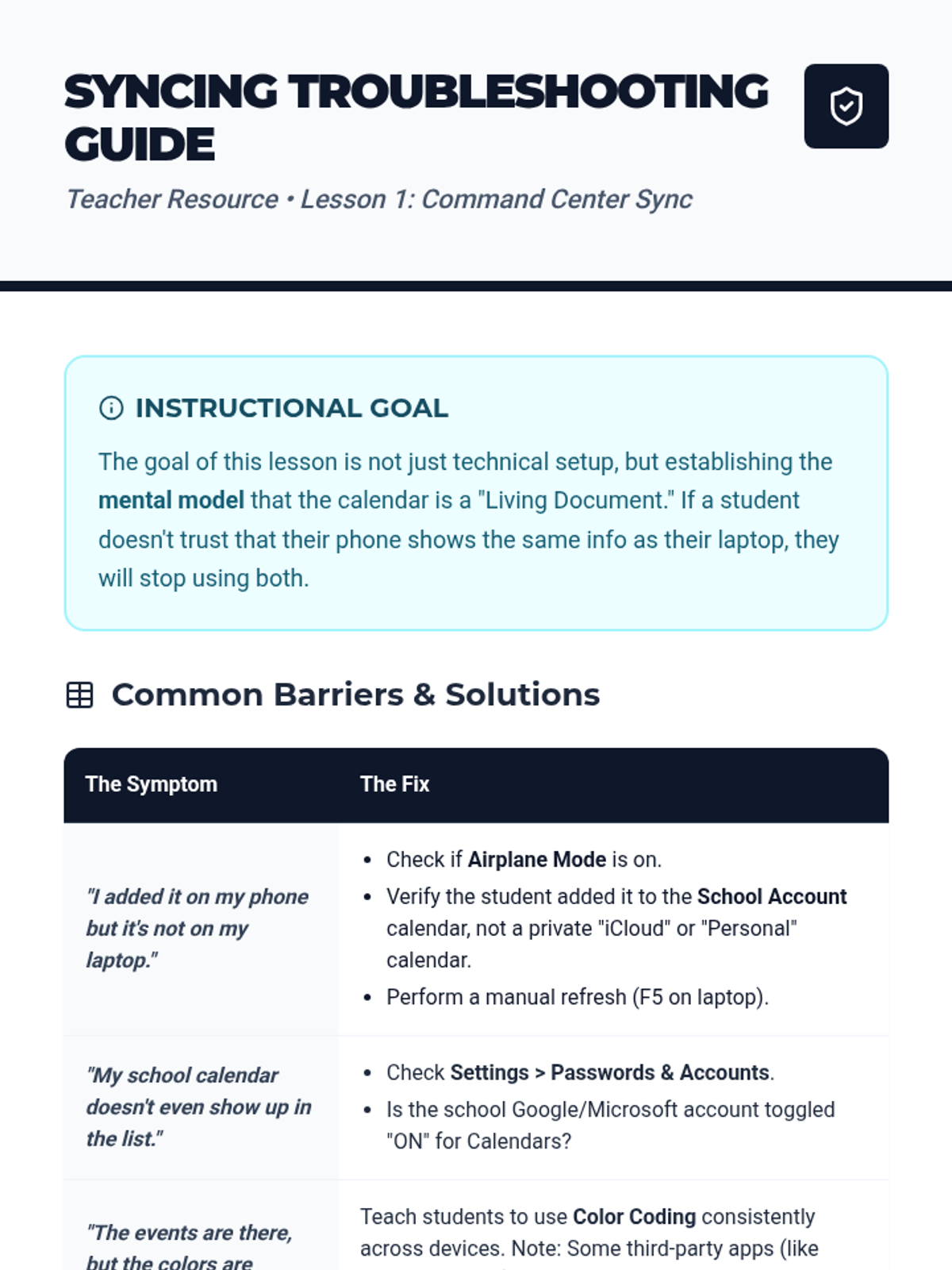 This sequence guides students through the transition from physical to digital scheduling tools, focusing on app setup, visual timers, discreet notifications, time blocking, and contingency planning.