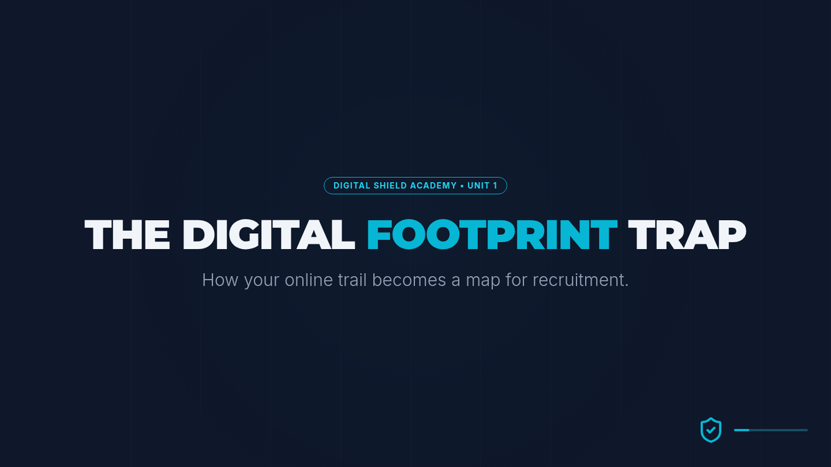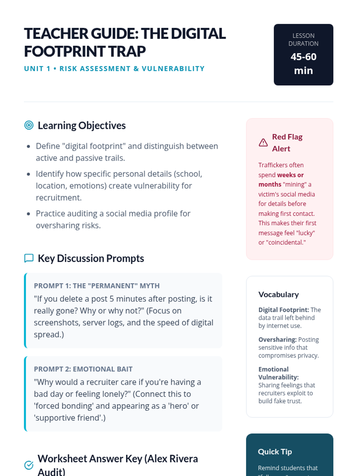A 5-lesson sequence for 6th graders focusing on identifying online recruitment tactics, understanding digital footprints, and implementing privacy shields to prevent exploitation and trafficking.