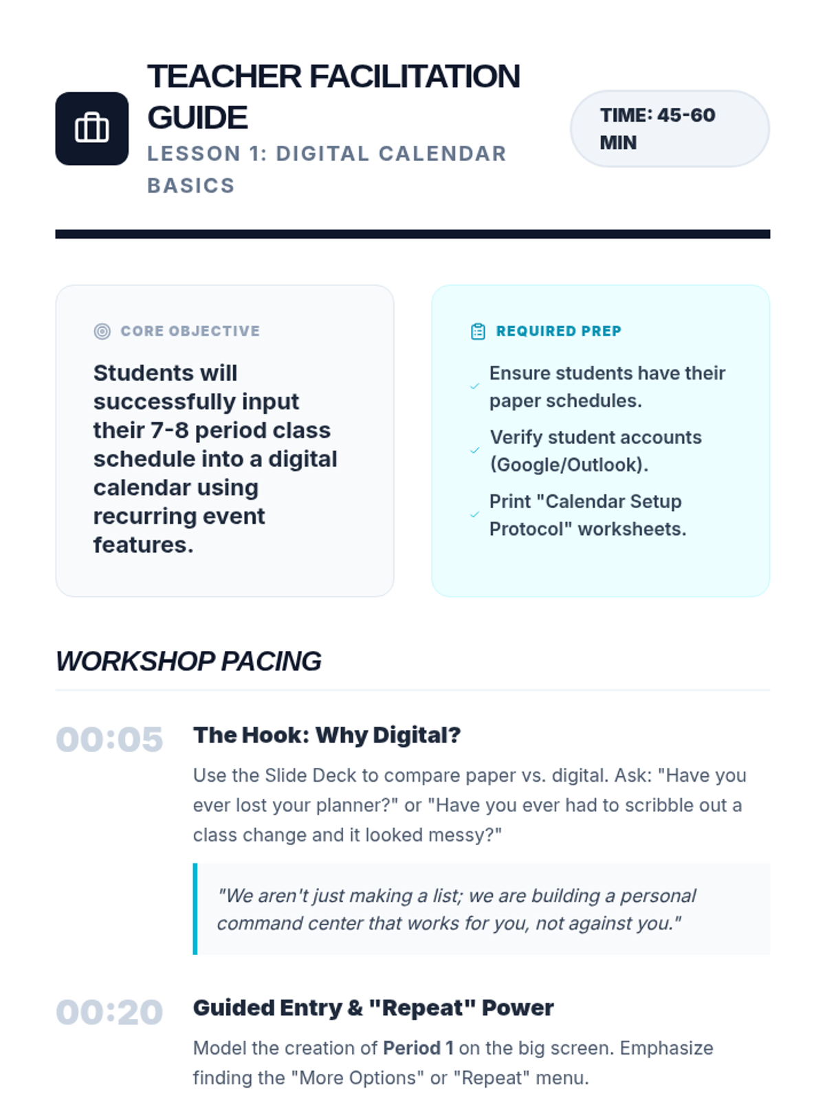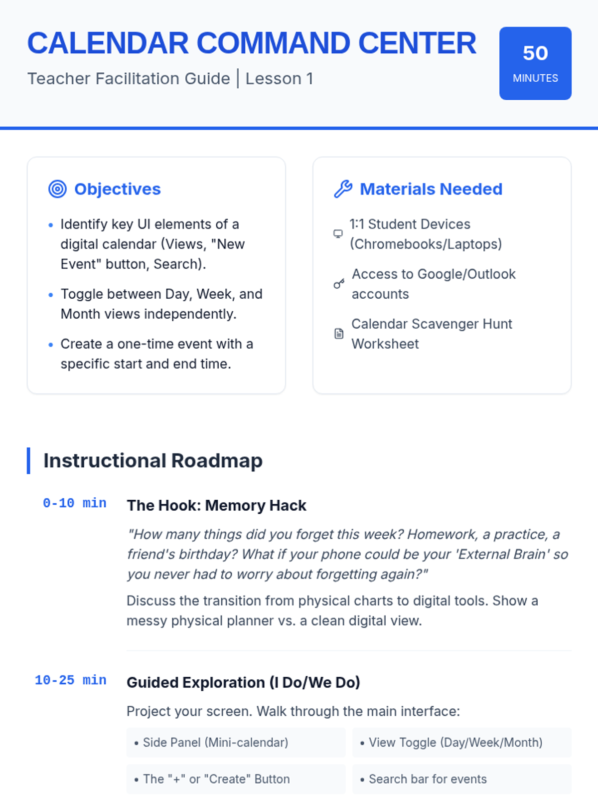 A sequence for 8th grade students to transition from physical to digital scheduling tools, focusing on calendars, reminders, and notifications. Students learn to use technology as an 'external brain' to manage their academic and personal lives.