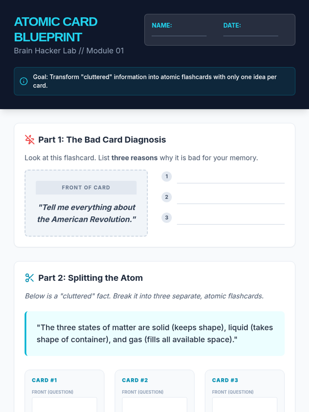 A comprehensive sequence designed to teach 7th-grade students the science and practice of spaced repetition. Students learn to design effective flashcards, build a physical Leitner Box system, and master the sorting algorithms required for long-term memory retention.