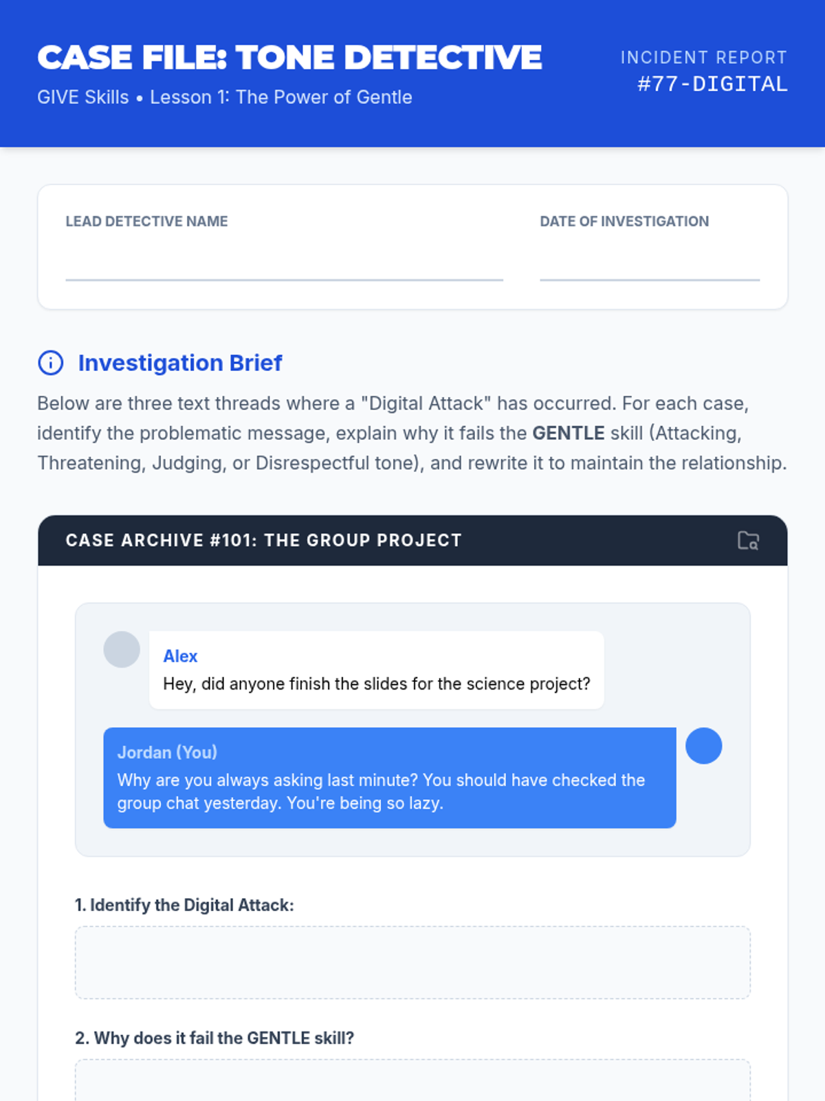 A project-based sequence for 8th graders on applying DBT GIVE skills to digital communication, focusing on empathy, tone, and conflict resolution in text-based environments.