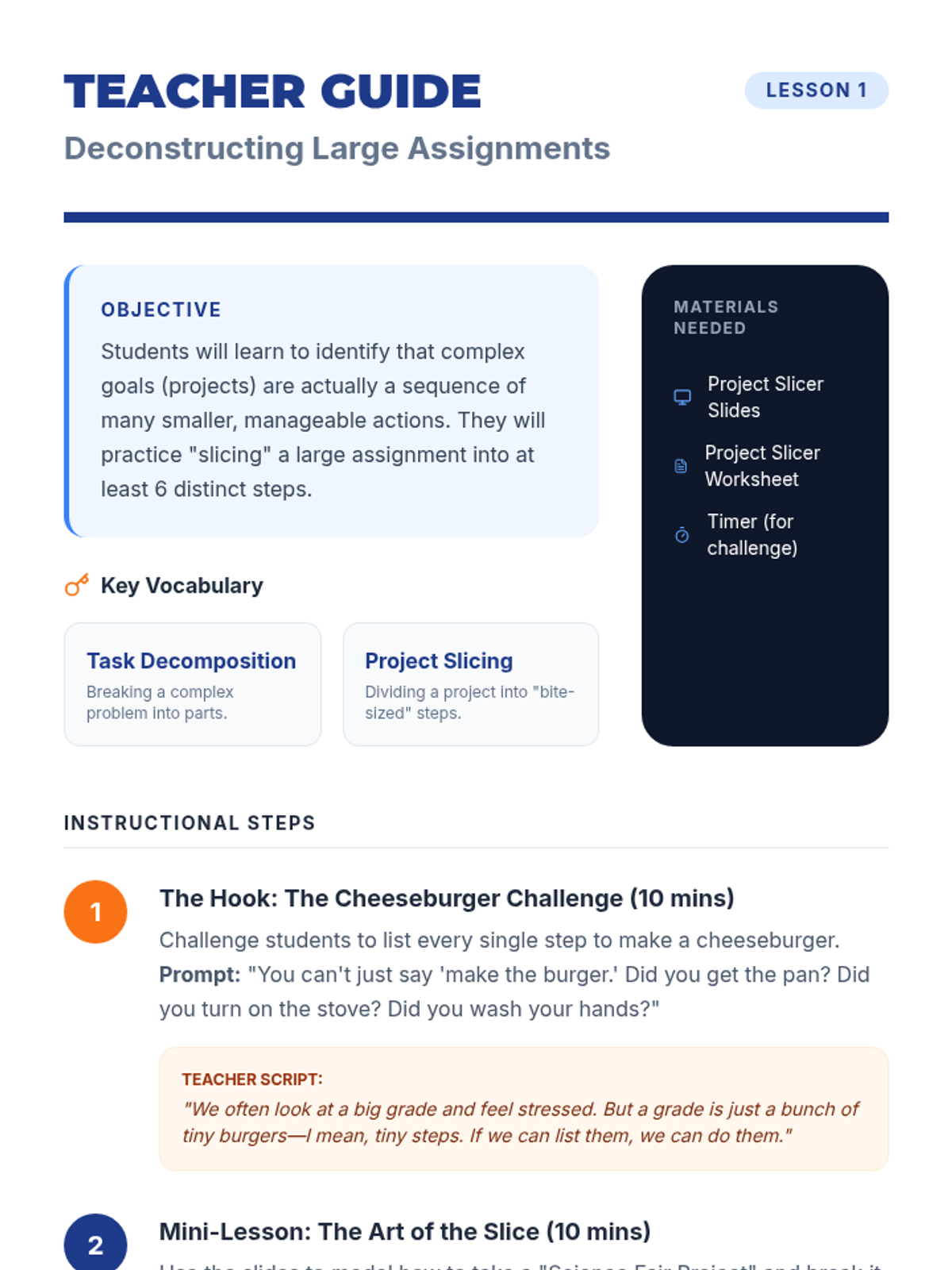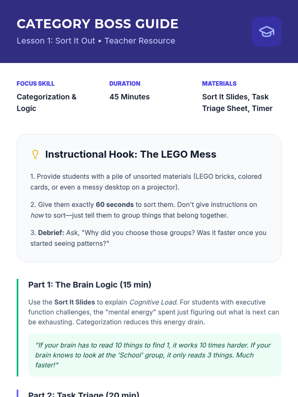 A comprehensive 5-lesson unit designed to equip 8th-grade students with essential executive function skills. Students transition from passive observers of their time to active managers of their academic and personal lives through data analysis, strategic prioritization, and environmental design.