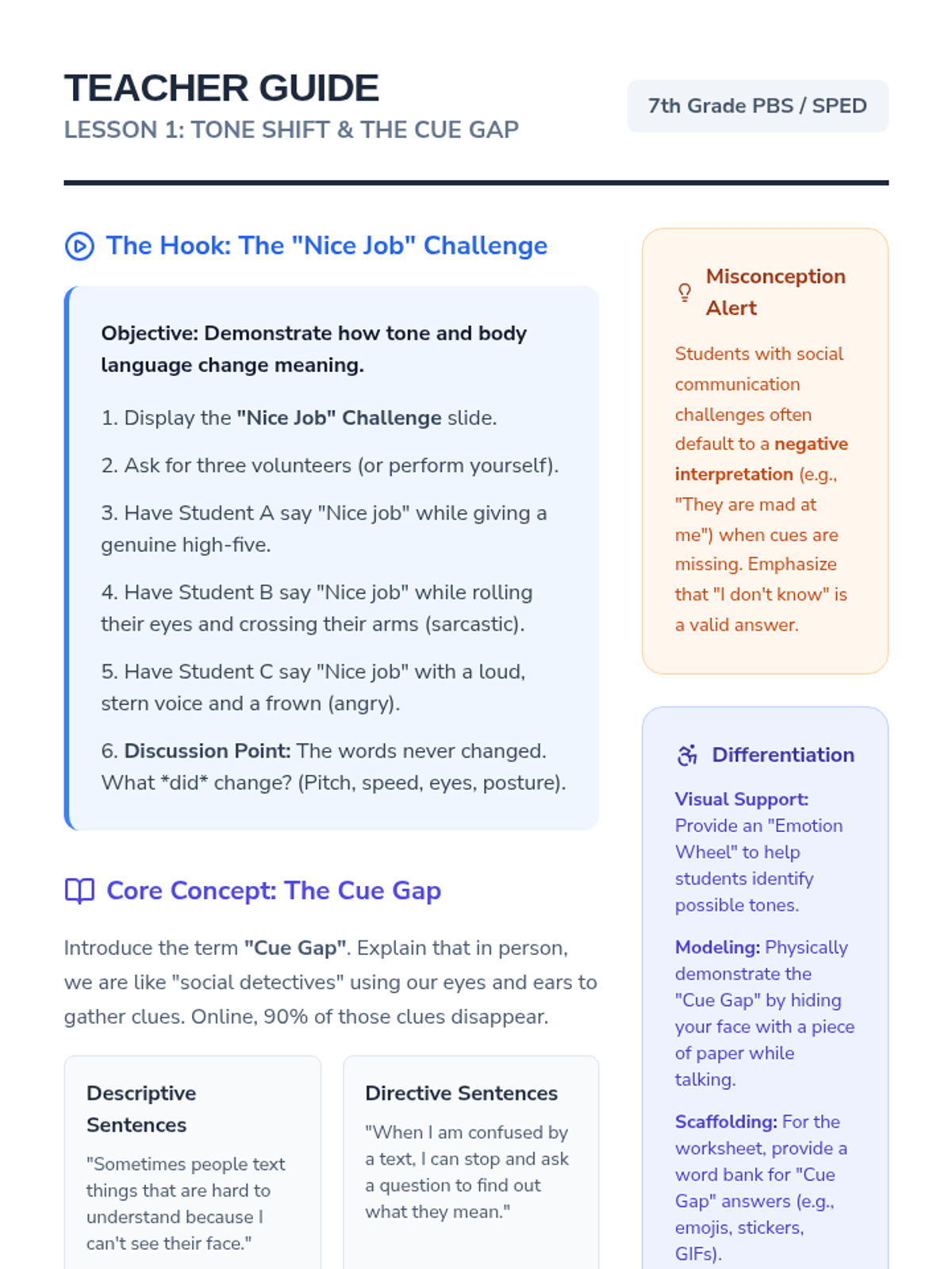 A 5-lesson sequence designed for 7th-grade students to translate social narrative techniques to digital communication. Students explore non-verbal cues, texting etiquette, impulse control, and gaming sportsmanship to build a personalized 'Digital Etiquette Guide'.